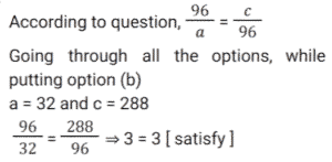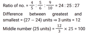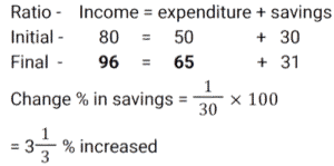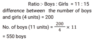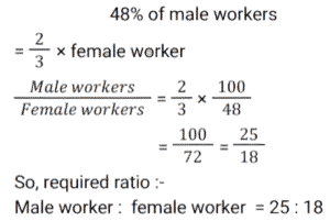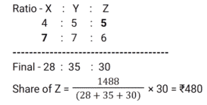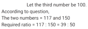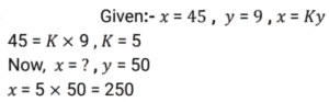 Ratio & Proportion (SSC) (Part-4)Total Questions: 5021. Given that x varies directly as y and x = 45 when y = 9. What is the value of x when y = 50 ? [SSC CHSL 17/08/2023 (1st Shift)](a) 225(b) 190(c) 175(d) 250Correct Answer: (d) 250Solution:22. Divide ₹ 1488 among X, Y and Z. If the shares are in the ratio X : Y = 4 : 5, Y : Z = 7 : 6, then find out the share of Z. [SSC CHSL 17/08/2023 (3rd Shift)](a) ₹ 460(b) ₹ 450(c) ₹ 470(d) ₹ 480Correct Answer: (d) ₹ 480Solution:23. The ratio of the number of boys to that of the girls in a school is 11 : 15. If there are 200 more girls than boys in the school, what is the number of boys in that school ? [SSC CGL 14/07/2023 (4th shift)](a) 550(b) 750(c) 506(d) 605Correct Answer: (a) 550Solution:24. The ratio between the monthly income and the expenditure of Vaidic is 8: 5. If his income increases by 20% and his expenditure increases by 30%, then find the percentage increase or decrease in his monthly savings. [SSC CGL 14/07/2023 (4th shift)](a)(b)(c)(d)Correct Answer: (c)Solution:25. In a factory, 48% of the number of male workers is equal to two-third of the number of female workers. What is the ratio of the number of males to that of the females in the factory ? [SSC CGL 18/07/2023 (2nd shift)](a) 25 : 12(b) 12 : 25(c) 18 : 25(d) 25 : 18Correct Answer: (d) 25 : 18Solution:26. Two numbers are, respectively, 17% and 50% more than a third number. The ratio of the two numbers is: [SSC CGL 19/07/2023 (4th shift)](a) 27 : 25(b) 39 : 50(c) 19 : 11(d) 29 : 25Correct Answer: (b) 39 : 50Solution:27. If a : b :: b : c, and b = 96, then which of the following can be a possible pair of values of a and c ? [SSC CGL 20/07/2023 (2nd shift)](a) a = 24 ; c = 374(b) a = 32 ; c = 288(c) a = 48 ; c = 168(d) a = 16 ; c = 586Correct Answer: (b) a = 32 ; c = 288Solution:28. Three numbers are in the ratio 4/5 : 5/6 : 9/10. The diffrence between the smallest and the greatest numbers is 12. Find the number which is neither the smallest nor the greatest. [SSC CGL 24/07/2023 (2nd shift)](a) 96(b) 108(c) 100(d) 104Correct Answer: (c) 100Solution:29. A pole is 9030 cm long. It is colored saffron, white and green in the ratio of 6 : 7 : 8. Find the length of the green part of the pole. [SSC CGL 24/07/2023 (4th shift)](a) 3440cm(b) 3010cm(c) 3480cm(d) 2580cmCorrect Answer: (a) 3440cmSolution: 30. If a 7-storey building has a 28 m long shadow, the number of storeys of the building whose shadow is 48 m long is: [SSC CGL 26/07/2023 (3rd shift)](a)14(b) 24(c) 16(d) 12Correct Answer: (d) 12Solution:Submit Quiz« Previous12345Next »