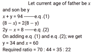 5. The sum of the present ages of a father and his son is 94 years. 8 years ago their respective ages were in the ratio of 2 : 1. After 10 years what will be the ratio of ages of father and son ? [SSC CHSL 17/03/2023 (4th Shift)]