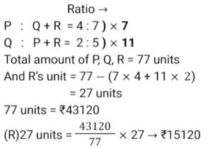 6. Rs. 43,120 is divided among P, Q and R such that P's share is 4/7 of total share of Q and R together and Q's share is 2/5 of total share of P and R together. What is the share of R ? [SSC CHSL 21/03/2023 (3rd Shift)]