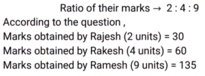 8. The ratio of marks obtained by Rajesh, Rakesh and Ramesh in an exam is 2 : 4 : 9. What are the marks obtained by Rakesh and Ramesh, if Rajesh scored 30 marks in the exam? [SSC CGL Tier II (03/03/2023)]