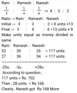 9. By mistake, instead of dividing ₹702 among Ram, Ramesh, and Naresh in the ratio 1/3 : 1/4 : 1/6, it was divided in the ratio of 3 : 4 : 6. Who gained the most and by how much? [SSC CGL 02/12/2022 (1st Shift)]