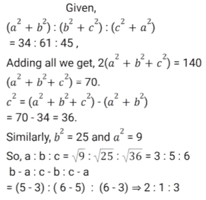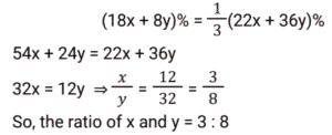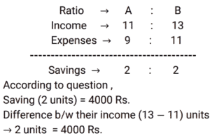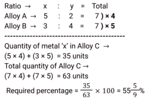 Ratio & Proportion (SSC) (Part-5)Total Questions: 5041. Two numbers, A and B, are such that the sum of 10% of A and 8% of B is (3/5)th of the sum of 12% of A and 16% of B. The ratio of A : B is : [SSC CHSL 31/05/2022 (Afternoon)](a) 2 ∶ 3(b) 4 ∶ 7(c) 2 ∶ 7(d) 4 ∶ 3Correct Answer: (b) 4 ∶ 7Solution:42. Two numbers X and Y are such that the sum of 18% of X and 8% of Y is one-third of the sum of 22% of X and 36% of Y. Find the ratio of X and Y [SSC CHSL 02/06/2022 (Afternoon)](a) 2 : 5(b) 3 : 11(c) 3 : 8(d) 8 : 3Correct Answer: (c) 3 : 8Solution:43. If 60% of a number is equal to three-fourth of another number, what is the ratio of the first number to the second number? [SSC CHSL 07/06/2022 (Evening)](a) 3 : 7(b) 2 : 5(c) 7 : 3(d) 5 : 4Correct Answer: (d) 5 : 4Solution:44. P, Q and R are batsmen. The ratio of the runs scored by them in a certain match was P ∶ Q = 16 : 17 and Q : R = 15 ∶ 16. At the end of the match, they scored a total of 956 runs. The number of runs scored by R is (nearest to an integer): [SSC CHSL 09/06/2022 (Afternoon)](a) 440(b) 335(c) 339(d) 430Correct Answer: (c) 339Solution:45. A varies jointly with B and C. A = 6 when B = 3 and C = 2. Find A when B = 5 and C = 7. [SSC CHSL 10/06/2022 (Evening)](a) 17.5(b) 35(c) 105(d) 70Correct Answer: (b) 35Solution:46. The ratio of the monthly incomes of A and B is 11 : 13 and the ratio of their expenditure is 9 : 11. If both of them manage to save ₹ 4,000 per month, then find the difference in their incomes (in ₹). [SSC CGL 11/04/2022 (Morning)](a) 2,500(b) 3,200(c) 4,000(d) 3,00Correct Answer: (c) 4,000Solution:47. At present, A is younger than B by 8 years. If 4 years ago, their ages were in the ratio of 1 : 2, then what is the present age of B (in years)? [SSC CGL 12/04/2022 (Morning)](a) 11(b) 20(c) 12(d) 18Correct Answer: (b) 20Solution: 48. If a, b and c are positive numbers such that (a² + b²) : (b² + c²) : (c² + a²) = 34 : 61 : 45, then b - a : c - b : c - a = _________ . [SSC CGL Tier II (29/01/2022)](a) 1 : 2 : 3(b) 3 : 1 : 2(c) 2 : 1 : 3(d) 3 : 2 : 1Correct Answer: (c) 2 : 1 : 3Solution:49. The income of A is 2/3 of B's income and the expenditure of A is 3/4 of B's expenditure. If 1/3 of the income of B is equal to the expenditure of A, then the ratio of the savings of A to those of B is: [SSC CGL Tier II (29/01/2022)](a) 3 : 4(b) 3 : 5(c) 5 : 3(d) 4 : 3Correct Answer: (b) 3 : 5Solution: 50. Alloy A contains metals x and y only in the ratio 5 : 2, while alloy B contains them in the ratio 3 : 4. Alloy C is prepared by mixing alloys A and B in the ratio 4 : 5. The percentage of x in alloy C is: [SSC CGL Tier II (29/01/2022)](a)(b)(c)(d)Correct Answer: (d)Solution:Submit Quiz« Previous12345