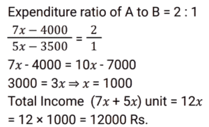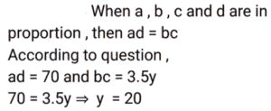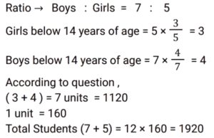 Ratio & Proportion (SSC) (Part-6)Total Questions: 3431. The ratio of the incomes of A and B is 7 : 5. A and B save Rs. 4,000 and Rs. 3,500, respectively. If the expenditure of B is half the expenditure of A, then the total income of A and B (in Rs.) will be: [SSC CHSL 05/08/2021 (Afternoon)](a) 10,000(c) 12,000(c) 12,000(d) 15,000Correct Answer: (c) 12,000Solution:32. In a proportion, the product of the first and fourth terms is 70 and that of the second and third items is 3.5y. The value of y is. [SSC CHSL 09/08/2021 (Morning)](a) 17(c) 15(b) 20(d) 22Correct Answer: (b) 20Solution:33. Seven years ago,the ratio of the ages of A and B was 4 : 5. Eight years hence, the ratio of the ages of A and B will be 9 : 10. What is the sum of their present ages in years? [SSC CPO 23/11/2020 (Morning)](a) 41(b) 82(c) 32(d) 56Correct Answer: (a) 41Solution:34. In a school, 5/12 of the number of students are girls and the rest are boys, 4/7 of the number of boys are below 14 years of age, and 2/5 of the number of girls are 14 years or above 14 years of age. If the number of students below 14 years of age is 1120, then the total number of students in the school is: [SSC CPO 25/11/2020 (Evening)](a) 1820(b) 1900(c) 1920(d) 1290Correct Answer: (c) 1920Solution:Submit Quiz« Previous1234