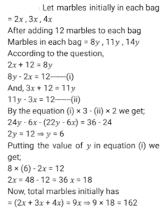 1. The number of marbles in three bags is in the ratio of 2 : 3 : 4. If 12 marbles are added to each bag, then the ratio changed to 8 : 11 : 14. The total number of marbles in the beginning was: [SSC MTS 28/10/2024 (Morning)]