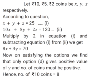 3. A payment of ₹120 is made with ₹10, ₹5 and ₹2 coins. A total of 25 coins are used. Which of the following is the number of ₹10 coins used in the payment? [SSC CGL 12/09/2024 (1st Shift)]