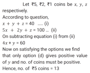 6. R pays ₹100 to P with ₹5, ₹2 and ₹1 coins. The total number of coins used for paying are 40. What is the number of coins of denomination ₹5 in the payment? [SSC CGL 09/09/2024 (1st Shift)]