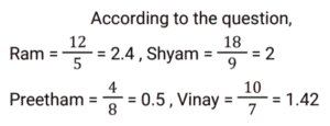 10. Ram has 12 hens and 5 cows, Shyam has 18 hens and 9 cows, Preetham has 4 hens and 8 cows, and Vinay has 10 hens and 7 cows. Who has a greater ratio of hens to cows? [SSC CPO 05/10/2023 (2nd Shift)]