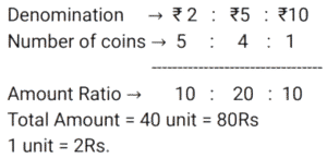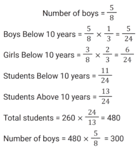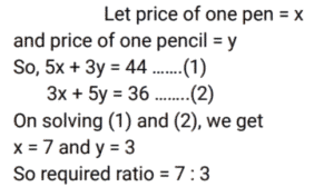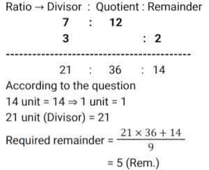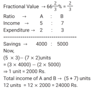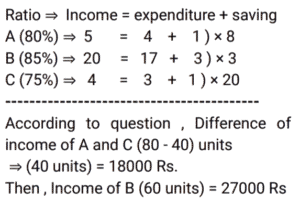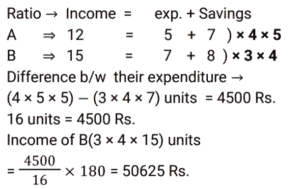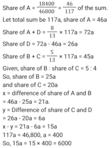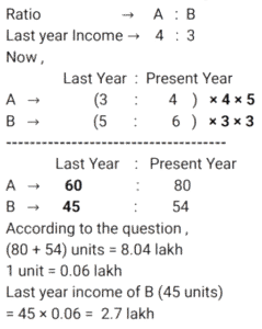 Ratio & Proportion (SSC)Total Questions: 5031. The ratio of income of A to that of B is 4 : 3. The expenditure of A is 5/12 of his income and the expenditure of B is 7/15 of his income. The diffrence between is ₹4,500. Find the income of B. [SSC CHSL 25/05/2022 (Evening)](a) ₹49,625(b) ₹48,625(c) ₹51,625(d) ₹50,625Correct Answer: (d) ₹50,625Solution:32. A sum of ₹46,800 is divided among A, B, C and D in such a way that the ratio of the combined share of A and D to the combined share of B and C is 8 : 5. The ratio of the share of B to that of C is 5: 4. A receives ₹18,400. If x is the difference between the shares of A and B and y is the difference between the shares of C and D, then what is the value of (x - y) (in ₹) ? [SSC CGL Tier II (29/01/2022)](a) 6000(b) 6500(c) 5000(d) 7000Correct Answer: (a) 6000Solution:33. If a number of pens and pencils are bought in the ratio of 5 : 3, then Ashok has to pay ₹44. If the ratio is changed as 3 : 5, then he has to pay ₹36. Find the ratio of the price of one pen to one pencil. [SSC MTS 11/10/2021 (Evening)](a) 5 : 3(b) 7 : 3(c) 8 : 5(d) 7 : 4Correct Answer: (b) 7 : 3Solution:34. Atul purchased Bread costing Rs.20 and gave a 100 rupee note to the shopkeeper. The shopkeeper gave the balance money in coins of denomination 2, 5, and 10. If these coins are in the ratio 5 : 4 : 1, then how many 5 coins did the shopkeeper give? [SSC CGL 03/08/2021 (Evening)](a) 5(b) 6(c) 8(d) 4Correct Answer: (c) 8Solution: 35. In a school, 3/8 of the number of students are girls and the rest are boys, One - third of the number of boys are below 10 years and 2/3 of the number of girls is also below 10 years. If the number of students of age 10 or more years is 260, then the number of boys in the school is: [SSC CGL Tier II (15/11/2020)](a) 280(b) 300(c) 234(d) 312Correct Answer: (b) 300Solution:36. By adding 3 and 5 in numerator and denominator of a fraction it becomes 2/3. If 1 and 3 are subtracted and added from numerator and denominator respectively, it becomes 2/5. Find the fraction. [SSC CHSL 19/10/2020 (Morning shift)](a) 5/7(b) 6/7(c) 7/6(d) 7/5Correct Answer: (a) 5/7Solution:37. A, B and C spend 80%, 85% and 75% of their incomes, respectively. If their savings are in the ratio 8 : 9 : 20 and the difference between the incomes of A and C is Rs. 18,000 , then the income of B is : [SSC CGL Tier II (13/09/2019)](a) Rs. 24,000(b) Rs. 27,000(c) Rs. 30,000(d) Rs. 36,000Correct Answer: (b) Rs. 27,000Solution:38. The ratio of income of A and B last year was 4 : 3, respectively. The ratios of their individual incomes of the last year and the present year are 3 : 4 and 5 : 6, respectively. If their total income for the present year is Rs. 8.04 lakh, then the income of B last year was : [SSC CGL Tier II (12/09/2019)](a) Rs. 2.7 lakh(b) Rs. 3.6 lakh(c) Rs. 2.4 lakh(d) Rs. 2.8 lakhCorrect Answer: (a) Rs. 2.7 lakhSolution:39. The ratio of the income of A to that of B is 5 : 7. A and B save Rs. 4000 and Rs. 5000 respectively. If the expenditure of A is equal to 66⅔% of the expenditure of B, then the total income of A and B is: [SSC CGL Tier II (11/09/2019)](a) Rs. 25,200(b) Rs. 24,000(c) Rs. 26,400(d) Rs. 28,800Correct Answer: (b) Rs. 24,000Solution:40. The ratio between the divisor and remainder is 3 : 2 and the ratio between the divisor and the quotient is 7 : 12. If the remainder is 14, then find the remainder when the dividend is divided by 9. [SSC MTS 21/08/2019 (Morning)](a) 3(b) 6(c) 4(d) 5Correct Answer: (d) 5Solution:Submit Quiz« Previous12345Next »