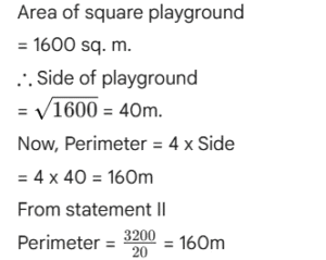 RBI GRADE ‘B’ OFFICER’S EXAM Held on : 17.11.2002 (Part-III)Total Questions: 5041. Each of the questions below consists of a statement and/or a question and two statements numbered I and II given below it. You have to decide whether the data provided in the statements are sufficient to answer the question. Read both the statements and-Give answer (1) if the data in Statement I alone are sufficient to answer the question, while the data in Statement II alone are not sufficient to answer the question. Give answer (2) if the data in Statement II alone are sufficient to answer the question, while the data in Statement I alone are not sufficient to answer the question. Give answer (3) if the data either in Statement I or in Statement II alone are sufficient to answer the question.Give answer (4) if the data even in both Statements I and II together are not sufficient to answer the question. Give answer (5) if the data in both Statements I and II together are necessary to answer the question. (Caution : Do not hasten to mark the answer unless you consider both the Statements carefully).A box contains oranges, bananas and apples. How many apples are there in the box ?I. Of the hundred fruits in the box, fifty percent constitute oranges and bananas together.II. Fifty percent of the fruits in the box are apples.(1)(2)(3)(4)(5)Correct Answer: (1)Solution:From statement I There are 50 apples in the box. From statement II 50 per cent of fruits in the box are apples. The number of fruits is not known.42. Each of the questions below consists of a statement and/or a question and two statements numbered I and II given below it. You have to decide whether the data provided in the statements are sufficient to answer the question. Read both the statements and-Give answer (1) if the data in Statement I alone are sufficient to answer the question, while the data in Statement II alone are not sufficient to answer the question. Give answer (2) if the data in Statement II alone are sufficient to answer the question, while the data in Statement I alone are not sufficient to answer the question. Give answer (3) if the data either in Statement I or in Statement II alone are sufficient to answer the question.Give answer (4) if the data even in both Statements I and II together are not sufficient to answer the question. Give answer (5) if the data in both Statements I and II together are necessary to answer the question. (Caution : Do not hasten to mark the answer unless you consider both the Statements carefully).The area of a playground is 1600 square metres. What is its perimeter ?I. It is perfect square play- ground.II. It costs Rs. 3200 to put a fence around the playground at the rate of Rs. 20/- per metre.(1)(2)(3)(4)(5)Correct Answer: (3)Solution:From statement IThus, data either in Statement I or in Statement II alone are sufficient to answer the question.43. Each of the questions below consists of a statement and/or a question and two statements numbered I and II given below it. You have to decide whether the data provided in the statements are sufficient to answer the question. Read both the statements and-Give answer (1) if the data in Statement I alone are sufficient to answer the question, while the data in Statement II alone are not sufficient to answer the question. Give answer (2) if the data in Statement II alone are sufficient to answer the question, while the data in Statement I alone are not sufficient to answer the question. Give answer (3) if the data either in Statement I or in Statement II alone are sufficient to answer the question.Give answer (4) if the data even in both Statements I and II together are not sufficient to answer the question. Give answer (5) if the data in both Statements I and II together are necessary to answer the question. (Caution : Do not hasten to mark the answer unless you consider both the Statements carefully).A, B, C and D made their project presentation, one on each day, on four consecutive days but not necessarily in that order. On which day did 'C' make his presentation ?I. The first presentation was made on 23rd, Tuesday and was followed by 'D's presentationII. 'A' did not make his presentation on 25th and one of them made his presentation, between that of A's and B's.(1)(2)(3)(4)(5)Correct Answer: (5)44. Each of the questions below consists of a statement and/or a question and two statements numbered I and II given below it. You have to decide whether the data provided in the statements are sufficient to answer the question. Read both the statements and-Give answer (1) if the data in Statement I alone are sufficient to answer the question, while the data in Statement II alone are not sufficient to answer the question. Give answer (2) if the data in Statement II alone are sufficient to answer the question, while the data in Statement I alone are not sufficient to answer the question. Give answer (3) if the data either in Statement I or in Statement II alone are sufficient to answer the question.Give answer (4) if the data even in both Statements I and II together are not sufficient to answer the question. Give answer (5) if the data in both Statements I and II together are necessary to answer the question. (Caution : Do not hasten to mark the answer unless you consider both the Statements carefully).What is the shortest distance between Devipur and Durgapur ?I. Durgapur is 20 kms. away from Rampur.II. Devipur is 15 kms. away from Rampur.(1)(2)(3)(4)(5)Correct Answer: (5)Solution:From statement I Durgapur is 20km away from Rampur. There is no mention of direction. From statement II Devipur is 15km away from Rampur. There is no mention of direction: In the question, it has been asked to find out the shortest distance between Devipur and Durgapur. If we take the three places in a straight line the shortest distance between Devipur and Durgapur will be 5 km.45. Each of the questions below consists of a statement and/or a question and two statements numbered 