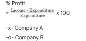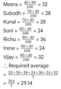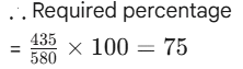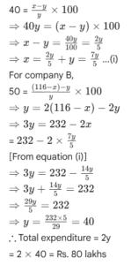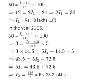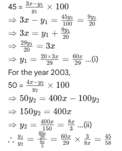 RBI GRADE ‘B’ OFFICER’S EXAM Held on : 2007 (Part-III)Total Questions: 5011. Study the following table to answer the given questions :Percentage of Marks obtained by Seven students in six subjects"Subjects(Max. Marks:) English (60)History (40)Computers (130)Maths (150)Science (120)Economics (80)StudentMeera1008050909060Subodh8070801008040Kunal907060907070Soni606065808080Richu509062808595Irene406064706585Vijay808035655075What are the total marks obtained by Meera in all the subjects?(1) 448(2) 580(3) 470(4) 74.67(5) None of theseCorrect Answer: (1) 448Solution:Marks obtained by Meera in :English = 60History = 40× 80 × 100 = 32Computers = 50 × 130 × 100 = 65Maths = 10090 × 150 = 135Science = 90 × 120 × 100 = 108Economics = 10060×80 = 48∴ Total marks= 60 + 32 + 65 + 135 + 108 + 48 = 44812. Study the following table to answer the given questions :Percentage of Marks obtained by Seven students in six subjects"Subjects(Max. Marks:) English (60)History (40)Computers (130)Maths (150)Science (120)Economics (80)StudentMeera1008050909060Subodh8070801008040Kunal907060907070Soni606065808080Richu509062808595Irene406064706585Vijay808035655075What are the average marks obtained by these seven students in History? (rounded off to two digits)(1) 72.86(2) 27.32(3) 24.86(4) 29.14(5) None of theseCorrect Answer: (4) 29.14Solution:Marks obtained in History by :13. Study the following table to answer the given questions :Percentage of Marks obtained by Seven students in six subjects"Subjects(Max. Marks:) English (60)History (40)Computers (130)Maths (150)Science (120)Economics (80)StudentMeera1008050909060Subodh8070801008040Kunal907060907070Soni606065808080Richu509062808595Irene406064706585Vijay808035655075How many students have got 60% or more marks in all the subjects ?(1) One(2) Two(3) Three(4) None(5) None of theseCorrect Answer: (2) Two14. Study the following table to answer the given questions :Percentage of Marks obtained by Seven students in six subjects"Subjects(Max. Marks:) English (60)History (40)Computers (130)Maths (150)Science (120)Economics (80)StudentMeera1008050909060Subodh8070801008040Kunal907060907070Soni606065808080Richu509062808595Irene406064706585Vijay808035655075What is the overall percentage of Kunal ?(1) 64(2) 65(3) 75(4) 64.24(5) None of theseCorrect Answer: (3) 75Solution:Total marks obtained by Kunal= 54 + 28 + 78 + 135 + 84 + 56 = 435Total marks= 60 + 40 + 130 + 150 + 12080 = 58015. Study the following table to answer the given questions :Percentage of Marks obtained by Seven students in six subjects"Subjects(Max. Marks:) English (60)History (40)Computers (130)Maths (150)Science (120)Economics (80)StudentMeera1008050909060Subodh8070801008040Kunal907060907070Soni606065808080Richu509062808595Irene406064706585Vijay808035655075In which subject is the overall percentage the best ?(1) Maths(2) Economics(3) History(4) Science(5) None of theseCorrect Answer: (1) Maths16. Study the following graph carefully and answer questions given below it. Percentage profit earned by two companies A and B over the years Total expenditure of Company A in all the years together was Rs. 128.5 lakhs. What was the total income of the Company in all the years together ?(1) Rs. 147.5 lakhs(2) Rs. 153 lakhs(3) Rs. 189.5 lakhs(4) Cannot be determined(5) None of theseCorrect Answer: (4) Cannot be determinedSolution:Overall per cent profit is not known.17. Study the following graph carefully and answer questions given below it. Percentage profit earned by two companies A and B over the yearsRatio of expenditures of Companies A and B in 2003 was 4:5 respectively. What was the respective ratio of their incomes in that year ?(1) 10 : 29(2) 20 : 29(3) 9 : 10(4) 21 : 26(5) None of theseCorrect Answer: (5) None of theseSolution:Let the expenditures of companies A and B in 2003 be Rs. 4x and 5x respectively. If their respective incomes be I₁ and I₂, then for company A,18. Study the following graph carefully and answer questions given below it. Percentage profit earned by two companies A and B over the years If the expenditures of Companies A and B in 2001 were equal and the total income of the two companies was Rs. 116 lakhs, what was the total expenditure of the two companies in that year ?(1) Rs. 65 lakhs(2) Rs. 80 lakhs(3) Rs. 42. lakhs(4) Cannot to determined(5) None of theseCorrect Answer: (2) Rs. 80 lakhsSolution:Let the income of company A= Rs. x lakhs. Income of company B = Rs. (116 - x) lakhs Let the expenditure of each company be Rs. y lakhs. For company A,19. Study the following graph carefully and answer questions given below it. Percentage profit earned by two companies A and B over the yearsIf the incomes of Company B in 2002 and 2003 were in the ratio of 3:4 respectively, what was the respective ratio of expenditures of that company in these two years ?(1) 29 : 45(2) 29 : 56(3) 45 : 58(4) 56 : 29(5) None of theseCorrect Answer: (3) 45 : 58Solution:Let the incomes of company B in 2002 and 2003 be Rs. 3x and Rs. 4x respectively. Let respective expenditures be Rs. y₁ and Rs. y₂. For the year 2002,20. Study the following graph carefully and answer questions given below it. Percentage profit earned by two companies A and B over the yearsExpenditures of Company A in 2004 and 2005 are Rs. 12 lakhs and Rs. 14.5 lakhs respectively. What was the total income of Company A in 2004 and 2005 together (in lakh Rs.) ?(1) 41.2(2) 38.5(3) 44.6(4) 36.9(5) None of theseCorrect Answer: (1) 41.2Solution:In the year 2004,∴ Total income = I₁ + I₂= Rs. (18 + 23.2) lakhs= Rs. 41.2 lakhs.Submit Quiz« Previous12345Next »