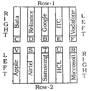 Ten persons from different companies viz. Samsung, Bata, Microsoft, Google, Apple, HCL, ITC, Reliance, Airtel and Vodafone are sitting in two parallel rows containing five people each, in such a way that there is an equal distance be-tween adjacent persons. In row-1, B, C, D, E and F are seated and all of them are facing south. In row-2, R, S, T, U and V are seated and all of them are facing north. Therefore, in the given seating arrangement, each member seated in a row faces another member of the other row. (All the information given above does not give the order of seating as in the final arrangement.)