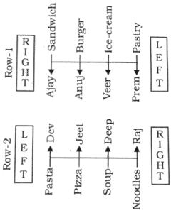 Eight persons ordered different items in a restaurant viz., Noodles, Pasta, Pizza, Burger, Pastry, Soup, Sandwich and Ice-cream. These eight persons are sitting in two parallel rows, containing four persons each, in such a way that there is an equal distance between adjacent persons. In Row-1, Anuj, Veer, Ajay and Prem are sitting, not necessarily in the same order and all of them are facing south. In Row-2 Dev, Jeet, Raj and Deep are sitting, not necessarily in the same order and all of them are facing north. Thus, in the given sitting arrangement each member of one row is facing another member of the other row.