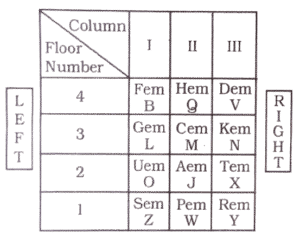 X’s department is one department below the one which is second to the right of department F. Q’s department is on the even numbered floor. J is an immediate neighbour of X. N’s department is to the immediate right above diagonally of the department that is immediately above the W’s department. Z’s department is to the immediate left below diagonally of the department that is to the immediate left below diagonally of department Kem. M’s department is to the immediate right above diagonally of the department that is one department below B’s department. V’s department is to the immediate right above diagonally of the department that is to the immediate left above diagonally of X’s department. O’s department is to the immediate left above diagonally of the department that is one department below M’s department. L’s department is to the immediate left above diagonally of the department that is to the immediate left below diagonally of N’s department. B’s department is just above the department that is to the immediate left below diagonally of Q’s department. Y’s department is to the immediate right below diagonally of the department that is to the immediate right below diagonally of department Gem.