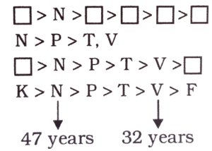 In a group of six friends N, T, K, V, P and F, each is of different age. N is younger than only one friend. P is older than T and V but not as old as N. V is older than only one friend. F is the youngest in the group. The age of V is 32 years and the age of friend who is second oldest is 47 years.