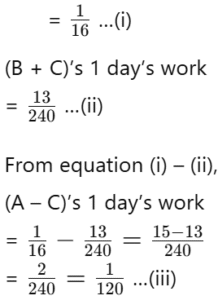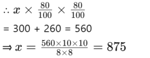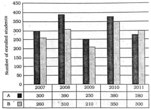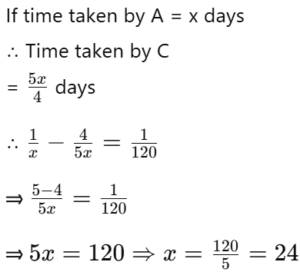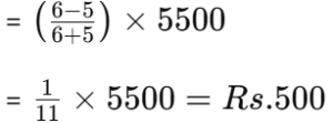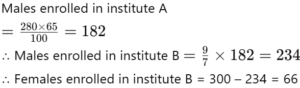 RBI OFFICER GRADE ‘B’ PHASE-I EXAM Held on : 09.11.2019(Part-II)Total Questions: 5011. 30 litre of pure water was mixed with 150 litre of pure milk, then 30 litre of this mixture was then sold and more quantity of pure milk and pure water was added in the respective ratio of 5 : 6. If the final quantity of milk was 500% of the initial quantity of water, what was the quantity of pure water that was added? (in litre)(1) 12(2) 30(3) 18(4) 24(5) 36Correct Answer: (2) 30Solution:In original mixture, Milk : Water = 150 : 30 = 5 : 1 In remaining 150 litres of mixture, Quantity of milk added = 5x litres Quantity of water added = 6x litres According to the question, ∴ Quantity of water added = 6x = 6 × 5 = 30 litres12. A and B started a business. B's investment was 2.5 timesthat of A. The respective ratio between the time period for which A invested and that for which B invested was 3 : 1. If the total investment made by A and B together was Rs. 28,000 and the annual profit earned was Rs. 2,500 less than A's investment, what was the difference between A's share and B's share in the annual profit?(1) Rs. 200(2) Rs. 800(3) Rs. 500(4) Rs. 400(5) Rs. 650Correct Answer: (3) Rs. 500Solution:Ratio of investments of A and B = 1: 2.5 = 10 : 25= 2: 5 Total investment = Rs. 28000 ∴ A's investment = Rs. 20000∴ Total annual profit= 8000 – 2500 = Rs. 5500Ratio of shares= 8000 × 3 : 20000= 24 : 20 = 6 : 5∴ Required difference 13. Study the table and answer the given questions.From the questions (13-17) Data related to number of students enrolled for a vocational course in two institutes (A & B) during 5 years: The total number of enrolled students in institutes A and B together in 2012 is 60% less than that in 2010. If in 2012, the respective ratio of total number of male students in institutes A and B together and total number of female students in same institutes together was 3:1, total how many female students were enrolled in institutes A and B together in 2012?(1) 69(2) 67(3) 81(4) 65(5) 73Correct Answer: (5) 73Solution:Total students enrolled in both institutes in 2010 14. study the given table above carefully and answer the question.What is the difference between average number of students enrolled in institute A in 2008 and 2009 and that in institute B in 2008 and 2009?(1) 60(2) 50(3) 80(4) 90(5) 70Correct Answer: (1) 60Solution:Required difference 15. study the given table above carefully and answer the question.Total number of students enrolled in institutes A and B together decreased by 20% from 2005 to 2006 and again by 20% from 2006 to 2007. What was the total number of students enrolled in institutes A and B together in 2005?(1) 850(2) 875(3) 825(4) 950(5) 840Correct Answer: (2) 875Solution:Total number of students enrolled in both institutes in 2005 = x 16. study the given table above carefully and answer the question.In 2011, 65% of students enrolled in institute A were males. If the respective ratio between number of male students enrolled in institutes A and B in 2011 was 7:9, what was the number of female students enrolled in institute B in the same year?(1) 72(2) 66(3) 65(4) 75(5) 80Correct Answer: (2) 66Solution:In 2011, 17. study the given table above carefully and answer the question.Total number of students enrolled in institutes A and B together in 2009 is approximately what percent less than that enrolled in the same institutes in 2008?(1) 45(2) 20(3) 28(4) 34(5) 40Correct Answer: (5) 40Solution:Total students enrolled in both institutes in 2009= 250 + 210 = 460Total students enrolled in both institutes in 2008= 390 + 310 = 700∴ Required percent 18. Solve it.C is 20% less efficient than A. A and B together can finish a piece of work in 16 days. B and C together can do it in 18 ⁶⁄₁₃ days. In how many days can A alone finish the same piece of work?(1) 24(2) 25(3) 20(4) 30(5) 18Correct Answer: (1) 24Solution:(A + B)’s 1 day’s work 19. What approximate value will come in place of question mark (?) in the given questions? (You are not expected to calculate exact value)5.99 ÷ 2.01 × 17.03 - 47.96 = √?(1) 64(2) 25(3) 81(4) 9(5) 16Correct Answer: (4) 9Solution:20. What approximate value will come in place of question mark (?) in the given questions? (You are not expected to calculate exact value)1.99 × 3.01 - 14.97 × 4.98 + (8.99)² = ?(1) 4(2) 16(3) 12(4) 28(5) 20Correct Answer: (3) 12Solution:? = 2 × 3 - 15 × 5 + (9)²= 6 - 75 + 81 = 12Submit Quiz« Previous12345Next »