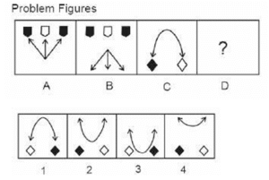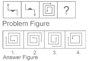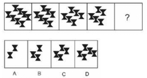Series Non – Verbal – Railway ReasoningTotal Questions: 3511. Study the given figure carefully and select the pattern that can replace the question mark (?) in it. [RRB NTPC 01/03/2021 (Morning)](a) ● ● ● ● ●(b) ● ● ●(c) ● ● ● ●(d) ● ● ● ● ● ●Correct Answer: (d) ● ● ● ● ● ●Solution:12. Find the next figure in the series. [RPF Constable 18/01/2019(Evening)](a)(b)(c)(d)Correct Answer: (d)Solution:13. Select from the options the appropriate figure that comes next in the given series. [RPF S.I. 19/12/2018 (Morning)](a)(b)(c)(d)Correct Answer: (b)Solution:14. Which one of the following options for a given series is a figure coming up in it? [RPF S.I. 06/01/2019 (Afternoon)](a)(b)(c)(d)Correct Answer: (a)Solution:15. Select the appropriate picture from the alternatives to proceed in the given series. [RPF S.I. 10/01/2019 (Morning)](a)(b)(c)(d)Correct Answer: (c)Solution:16. Which one of the alternative will be the next figure from the given alternatives for the given series? [RPF S.I. 10/01/2019 (Afternoon)](a)(b)(c)(d)Correct Answer: (d)Solution:17. Select the option that would come next in the following figure series. [RRB ALP 09/08/2018 (Evening)](a) D(b) C(c) A(d) BCorrect Answer: (b) CSolution:18. Choose the correct figure to replace the question mark. [RRB ALP 10/08/2018 (Morning)](a) 4(b) 3(c) 2(d) 1Correct Answer: (c) 2Solution:Figure 2 is the correct answer.19. Complete the series given in the Problem Figure with an appropriate option from the Answer Figures. [RRB ALP 14/08/2018 (Morning)](a) 3(b) 1(c) 4(d) 2Correct Answer: (a) 3Solution:20. Choose the correct figure from the answer figures that replaces the question mark. [RRB ALP 14/08/2018 (Afternoon)]Problem Figure(a) 3(b) 2(b) 2(d) 4Correct Answer: (b) 2Solution:Submit Quiz« Previous1234Next »