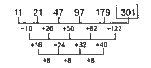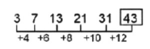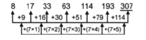 Series – Railway ReasoningTotal Questions: 501. S2L, P6N, M18P, J54R, G162T, ? [Group - D 17/08/2022 (Morning)](a) D486V(b) D324V(c) D386V(d) E486VCorrect Answer: (a) D486VSolution:2. 11, 21, 47, 97, 179, ? [Group - D 17/08/2022 (Afternoon)](a) 295(b) 281(c) 301(d) 231Correct Answer: (c) 301Solution:3. 3, 7, 13, 21, 31, ? [Group - D 17/08/2022 (Evening)](a) 44(b) 41(c) 42(d) 43Correct Answer: (d) 43Solution:4. Select the option that represents the letters that, when placed from left to right in the same sequence in the blanks below, will complete the letter series. [Group - D 18/08/2022 (Morning)]B _ M _ Q _ V M W _ B V M W _ B V _ _ T(a) WVBRSMW(b) WVRRMW(c) WVWSRMR(d) WVWBVSWMCorrect Answer: (a) WVBRSMWSolution:BVMWQ/BVMWR/BVMWS/BVMWT This series makes a pair of VWBRSMW.5. BE 2, GJ 3, LO 5, QT 7, ? [Group - D 18/08/2022 (Afternoon)](a) VY6(b) VY11(c) WX7 (d) WX6Correct Answer: (b) VY11Solution:6. D6W, G7T, M11N, V20E, ? [Group - D 22/08/2022 (Morning)](a) H34S(b) H36S(c) G36S(d) H36TCorrect Answer: (b) H36SSolution:7. 8, 9, 20, 63, 256, ? [Group - D 22/08/2022 (Afternoon)](a) 1286(b) 1284(c) 1280(d) 1285Correct Answer: (d) 1285Solution:8. Select the option that represents the letters that, when placed from left to right in the same sequence in the blanks below, will complete the letter series. [Group - D 25/08/2022 (Morning)]F _ L N _ S V _ Z C _(a) IPXF(b) IQXF(c) IPYF(d) IPXECorrect Answer: (a) IPXFSolution:Therefore the series becomes F I L N P S V X Z C F9. 8, 17, 33, 63, 114, 193, ? [Group - D 25/08/2022 (Afternoon)](a) 370(b) 347(c) 377(d) 307Correct Answer: (d) 307Solution:10. TDK-4, XHO-9, BLS-16, FPW-25, ? [Group - D 26/08/2022 (Evening)](a) JTA - 36(b) JTB - 36(c) JTA - 64(d) JUA - 36Correct Answer: (a) JTA - 36Solution:Submit Quiz12345Next »