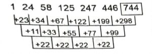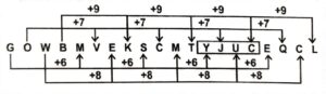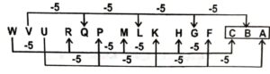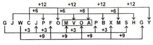 B + 5 = G, G + 5 = L, L + 5 = Q, Q + 5 = V