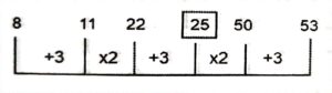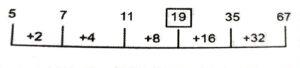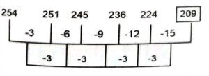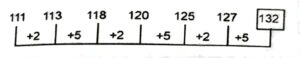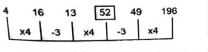 Series (SSC CHSL 2023 Tier – 1) (Part – I)Total Questions: 5011. J_SX, _WUT, NS_P, _OYL, RKA_ [S.S.C CHSL 02/08/2023 (3rd Shift)](a) AKVML(b) ALWPH(c) ALWLK(d) AKUOGCorrect Answer: (b) ALWPHSolution:The pattern followed here is :Hence, "ALWPH" is the correct answer.12. 111, 113, 118, 120, 125, 127, ? [S.S.C CHSL 02/08/2023 (3rd Shift)](a) 136(b) 132(c) 130(d) 134Correct Answer: (b) 132Solution:The pattern followed here is :Hence, "132" is the correct answer.13. Z _ TSVZV _ R _ XANP _ E [S.S.C CHSL 02/08/2023 (3rd Shift)](a) RWHA(b) HZPX(c) RWHZ(d) UROHCorrect Answer: (c) RWHZSolution:The pattern followed here is :Hence, "RWHZ" is the correct answer.14. PSU, GBL, ?, OTT, FCK [S.S.C CHSL 02/08/2023 (4th Shift)](a) ATC(b) UBH(c) XKC(d) ZKGCorrect Answer: (c) XKCSolution:The pattern followed here is :Hence, "XKC" is the correct answer.15. 4, 16, 13, ?, 49, 196 [S.S.C CHSL 02/08/2023 (4th Shift)](a) 38(b) 31(c) 44(d) 52Correct Answer: (d) 52Solution:The pattern followed here is :Hence, "52" is the correct answer.16. 5, 7, 11, ?, 35, 67 [S.S.C CHSL 02/08/2023 (4th Shift)](a) 19(b) 15(c) 13(d) 17Correct Answer: (a) 19Solution:The pattern followed here is :Hence, "19" is the correct answer.17. 254, 251, 245, 236, 224 ? [S.S.C CHSL 03/08/2023 (1st Shift)](a) 212(b) 209(c) 210(d) 206Correct Answer: (b) 209Solution:The pattern followed here is :Hence, "209" is the correct answer.18. Z_WV USR_ _NML KI_G F_CB [S.S.C CHSL 03/08/2023 (1st Shift)](a) YQOHD(b) XQPHD(c) XQOHD(d) YQPHDCorrect Answer: (b) XQPHDSolution:Each alphabet in the series decreases by -5. Z X WV / USR Q / PNML / KI H G / F D C B19. 8, 11, 22, ?, 50, 53 [S.S.C CHSL 03/08/2023 (1st Shift)](a) 37(b) 42(c) 35(d) 25Correct Answer: (d) 25Solution:The pattern followed here is :Hence, "25" is the correct answer.20. AEI_JL_QS _ SS_ ZXU [SSC CHSL 03/08/2023 (1st Shift)](a) BLSN(b) SSUU(c) SDMA(d) ONSBCorrect Answer: (d) ONSBSolution:The 1st letter in the series is increasing by 9, the 2nd letter by 7, 3rd letter is increasing by 5 and 4th letter is increasing by 2. AEI O / JL N Q / S S SS / B Z XUSubmit Quiz« Previous12345Next »