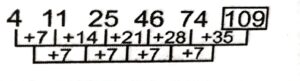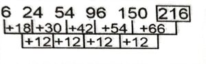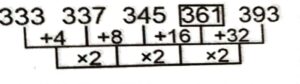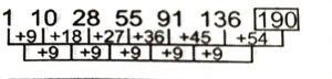 Series (SSC CHSL 2023 Tier – 1) (Part – I)Total Questions: 5021. 1, 10, 28, 55, 91, 136, ? [S.S.C CHSL 03/08/2023 (2nd Shift)](a) 190(b) 191(c) 192(d) 195Correct Answer: (a) 190Solution:The pattern followed here is :Hence, "190" is the correct answer.22. 4, 11, 25, 46, 74 ? [S.S.C CHSL 03/08/2023 (2nd Shift)](a) 105(b) 109(c) 111(d) 107Correct Answer: (b) 109Solution:The pattern followed here is :Hence, "109" is the correct answer.23. ADE, CFH, EHK, GJN, ? [S.S.C CHSL 03/08/2023 (2nd Shift)](a) IJK(b) HKQ(c) ILK(d) ILQCorrect Answer: (d) ILQSolution:The pattern followed here is :Hence, "ILQ" is the correct answer.24. BV 101, ?, DX 109, EY 113, FZ 117 [S.S.C CHSL 03/08/2023 (2nd Shift)](a) CW 105(b) CV 104(c) CW 106(d) CV 107Correct Answer: (a) CW 105Solution:The pattern followed here is :Hence, "CW 105" is the correct answer.25. MY 27, KZ 64, ?, GB 216, EC 343 [S.S.C CHSL 03/08/2023 (2nd Shift)](a) JB 81(b) JA 81(c) IA 125(d) HB 100Correct Answer: (c) IA 125Solution:The pattern followed here is :Hence, "IA 125" is the correct answer.26. YZN, HDI, QHD, ZLY, ? [S.S.C CHSL 03/08/2023 (3rd Shift)](a) IOT(b) JPT(c) IPT(d) JOTCorrect Answer: (c) IPTSolution:The pattern followed here is :Hence, "IPT" is the correct answer.27. 333, 337, 345, ?, 393 [S.S.C CHSL 03/08/2023 (3rd Shift)](a) 361(b) 349(c) 378(d) 382Correct Answer: (a) 361Solution:The pattern followed here is :Hence, "361" is the correct answer.28. BPY, ENB, ?, KJH, NHK [S.S.C CHSL 03/08/2023 (3rd Shift)](a) GLF(b) HLE(c) GMF(d) HMDCorrect Answer: (b) HLESolution:The pattern followed here is :Hence, "HLE" is the correct answer.29. 6, 24, 54, 96, 150, ? [S.S.C CHSL 03/08/2023 (4th Shift)](a) 216(b) 196(c) 220(d) 204Correct Answer: (a) 216Solution:The pattern followed here is :Hence, "216" is the correct answer.30. 31, 97, ?, 259, 355, 461 [S.S.C CHSL 03/08/2023 (4th Shift)](a) 127(b) 234(c) 189(d) 173Correct Answer: (d) 173Solution:The pattern followed here is :Hence, " 173" is the correct answer.Submit Quiz« Previous12345Next »