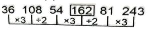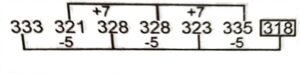 Series (SSC CHSL 2023 Tier – 1) (Part – I)Total Questions: 5031. JHF, MKI, PNL, ?, VTR [S.S.C CHSL 03/08/2023 (4th Shift)](a) SRP(b) PSO(c) PST(d) SQOCorrect Answer: (d) SQOSolution:The pattern followed here is :Hence, "SQO" is the correct answer.32. 333, 321, 328, 328, 323, 335, ? [S.S.C CHSL 04/08/2023 (1st Shift)](a) 316(b) 322(c) 318(d) 325Correct Answer: (c) 318Solution:The pattern followed here is :Hence, "318" is the correct answer.33. LT 48, ?, NV 42, OW 39, PX 36 [S.S.C CHSL 04/08/2023 (1st Shift)](a) MU 45(b) NU 44(c) NS 44(d) MS 46Correct Answer: (a) MU 45Solution:The pattern followed here is :Hence, "MU 45" is the correct answer.34. 999, 995, 986, 970, 945, ? [S.S.C CHSL 04/08/2023 (1st Shift)](a) 909(b) 905(c) 901(d) 906Correct Answer: (a) 909Solution:The pattern followed here is :Hence, "909" is the correct answer.35. W _ KY _ ENCYG _ GZIT _ _ KWO [S.S.C CHSL 04/08/2023 (1st Shift)](a) BXQGA(b) CXQKA(c) AYQGB(d) DXRKACorrect Answer: (b) CXQKASolution:The pattern followed here is :Hence, "CXQKA" is the correct answer.36. _XWV TS_Q ONM_ J_HG ED_B [SSC CHSL 04/08/2023 (2nd Shift)](a) YRLKA(b) YRLIC(c) ZRLKA(d) ZRLIACorrect Answer: (b) YRLICSolution:All letters are decreasing by -5. YXWV → TSRQ → ONML → JIHG → EDCB37. 36, 108, 54, ?, 81, 243 [S.S.C CHSL 04/08/2023 (2nd Shift)](a) 82(b) 88(c) 162(d) 170Correct Answer: (c) 162Solution:The pattern followed here is :Hence, "162" is the correct answer.38. DF _ _ L_P _ V_ [SSC CHSL 04/08/2023 (2nd Shift)](a) HJNRTX(b) GEMRSY(c) HIMSTY(d) GINRSXCorrect Answer: (a) HJNRTXSolution:All the alphabets are increasing by +6. DF H / J L N / P R T / V X39. B _ RGFK _ FJIX _ NGA _ _ EDC [S.S.C CHSL 04/08/2023 (3rd Shift)](a) NUFER(b) MUEDR(c) NVDEQ(d) MVEFQCorrect Answer: (b) MUEDRSolution:The pattern followed here is :Hence, "MUEDR" is the correct answer.40. QNR, WRU, CVX, IZA, ? [S.S.C CHSL 04/08/2023 (3rd Shift)](a) ODD(b) PHD(c) OHD(d) PNDCorrect Answer: (a) ODDSolution:The pattern followed here is :Hence, "ODD" is the correct answer.Submit Quiz« Previous12345Next »