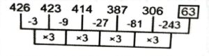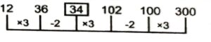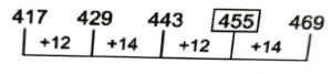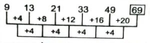 Series (SSC CHSL 2023 Tier – 1) (Part – III)Total Questions: 501. BP 74, ?, FT 64, HV 59, JX 54 [S.S.C CHSL 10/08/2023 (2nd Shift)](a) CS 70(b) DR 69(c) ET 68(d) ES 70Correct Answer: (b) DR 69Solution:The pattern followed here is :Hence, "DR69" is the correct answer.2. FGO, HIR, JKU, LMX, ? [S.S.C CHSL 10/08/2023 (2nd Shift)](a) NZP(b) NOA(c) NOP(d) NPZCorrect Answer: (b) NOASolution:The pattern followed here is :Hence, "NOA" is the correct answer.3. 9, 13, 21, 33, 49, ? [S.S.C CHSL 10/08/2023 (2nd Shift)](a) 67(b) 71(c) 65(d) 69Correct Answer: (d) 69Solution:The pattern followed here is :Hence, "69" is the correct answer.4. 417, 429, 443, ?, 469 [S.S.C CHSL 10/08/2023 (2nd Shift)](a) 452(b) 460(c) 455(d) 447Correct Answer: (c) 455Solution:The pattern followed here is :Hence, "455" is the correct answer.5. 426, 423, 414, 387, 306, ? [S.S.C CHSL 10/08/2023 (2nd Shift)](a) 62(b) 64(c) 65(d) 63Correct Answer: (d) 63Solution:The pattern followed here is :Hence, "63" is the correct answer.6. JK_ MJJ_ LMJKK_ MJJKKLL_ [SSC CHSL 10/08/2023 (3rd Shift)](a) MMJJ(b) LKLM(c) LMLJ(d) JKLJCorrect Answer: (b) LKLMSolution:Logic: Repetition of letters in the groups as follows: JKLM → JJKLM → JJJKKLM → JJJKKLLM7. QED, TKM, WQV, ZWE ? [S.S.C CHSL 10/08/2023 (2nd Shift)](a) BDO(b) DDN(c) CCN(d) DCMCorrect Answer: (c) CCNSolution:The pattern followed here is :Hence, "CCN" is the correct answer.8. C_ _ C_C_T_CT_ _T_ [SSC CHSL 10/08/2023 (3rd Shift)](a) TCCTCCTC(b) CTCCTTCT(c) TCTCCCCC(d) CCTTCTTTCorrect Answer: (c) TCTCCCCCSolution:CTC → CTC → CTC → CTC → CTC9. 12, 36, ?, 102, 100, 300 [S.S.C CHSL 10/08/2023 (3rd Shift)](a) 68(b) 34(c) 52(d) 76Correct Answer: (b) 34Solution:The pattern followed here is :Hence, "34" is the correct answer.10. 20, 110, 200, 290, 380 ? [S.S.C CHSL 10/08/2023 (3rd Shift)](a) 470(b) 490(c) 460(d) 480Correct Answer: (a) 470Solution:The pattern followed here is :Hence, "470" is the correct answer.Submit Quiz12345Next »