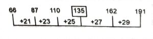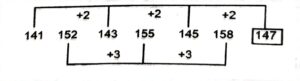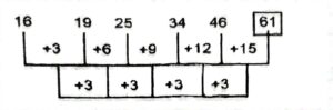 Series (SSC CHSL 2023 Tier – 1) (Part – III)Total Questions: 5031. HTD, DPZ, ?, VHR, RDN [S.S.C CHSL 11/08/2023 (4th Shift)](a) ZLX(b) XMW(c) ZLV(d) YMVCorrect Answer: (c) ZLVSolution:The pattern followed here is :Hence, "ZLV" is the correct answer.32. 71, 74, 72, 75, 73, 76, ? [S.S.C CHSL 11/08/2023 (4th Shift)](a) 75(b) 74(c) 77(d) 78Correct Answer: (b) 74Solution:The pattern followed here is :Hence, "74" is the correct answer.33. _QRS_ QRSPQ_SPQ_S [SSC CHSL 11/08/2023 (4th Shift)](a) PPRR(b) PQRS(c) PPQQ(d) RRSQCorrect Answer: (a) PPRRSolution:The correct order will be: PQRS → PQRS → PQRS → PQRS34. 141, 152, 143, 155, 145, 158, ? [S.S.C CHSL 14/08/2023 (1st Shift)](a) 147(b) 162(c) 148(d) 161Correct Answer: (a) 147Solution:The pattern followed here is :Hence, "147" is the correct answer.35. CN_F F_ZE ILC_ _KFC OJI_ [SSC CHSL 14/08/2023 (1st Shift)](a) VNDLA(b) XNDKB(c) XMCLA(d) WMDLBCorrect Answer: (d) WMDLBSolution:Logic: Here, 1st and 3rd letters are increasing by 3, and 2nd and 4th letters are decreasing by 1. The correct order will be: CNWF → FMZE → ILCD → LKFC → OJIB36. 16, 19, 25, 34, 46, ? [S.S.C CHSL 14/08/2023 (1st Shift)](a) 60(b) 58(c) 59(d) 61Correct Answer: (d) 61Solution:The pattern followed here is :Hence, "61" is the correct answer.37. R_R_D_ _ DR_ _ R_D_ [SSC CHSL 14/08/2023 (1st Shift)](a) DRDDDRRD(b) RDRRDRDD(c) DRRRRDRR(d) RDDRDDRDCorrect Answer: (c) DRRRRDRRSolution:The correct order will be: RDR → RDR → RDR → RDR → RDR38. 18, 72, ?, 1152, 4608 [S.S.C CHSL 14/08/2023 (2nd Shift)](a) 274(b) 218(c) 304(d) 288Correct Answer: (d) 288Solution:The pattern followed here is :Hence, "288" is the correct answer.39. MVJ, OYN, QBR, SEV, ? [S.S.C CHSL 14/08/2023 (2nd Shift)](a) THY(b) TGY(c) UHZ(d) UGXCorrect Answer: (c) UHZSolution:The pattern followed here is :Hence, "UHZ" is the correct answer.40. 66, 87, 110, ?, 162, 191 [S.S.C CHSL 14/08/2023 (2nd Shift)](a) 120(b) 125(c) 146(d) 135Correct Answer: (d) 135Solution:The pattern followed here is :Hence, "135" is the correct answer.Submit Quiz« Previous12345Next »