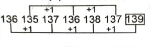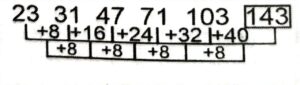 Series (SSC CHSL 2023 Tier – 1) (Part – IV)Total Questions: 1411. 12, ?, 68, 194, 572, 1706 [S.S.C CHSL 17/08/2023 (3rd Shift)](a) 32(b) 36(c) 26(d) 20Correct Answer: (c) 26Solution:The pattern followed here is :Hence, "26" is the correct answer.12. 23, 31, 47, 71, 103, ? [S.S.C CHSL 17/08/2023 (4th Shift)](a) 153(b) 147(c) 150(d) 143Correct Answer: (d) 143Solution:The pattern followed here is :Hence, "143" is the correct answer.13. 136, 135, 137, 136, 138, 137, ? [S.S.C CHSL 17/08/2023 (4th Shift)](a) 136(b) 140(c) 138(d) 139Correct Answer: (d) 139Solution:The pattern followed here is :Hence, "139" is the correct answer.14. A_CD _CDAC_, AB_, ABC [SSC CHSL 17/08/2023 (4th Shift)](a) AACD(b) AABB(c) BBDD(d) BDBDCorrect Answer: (c) BBDDSolution:The correct order will be: ABCD → BCDA → CDAB → DABCSubmit Quiz« Previous12