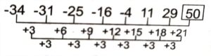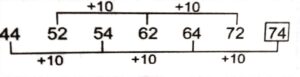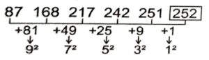 Series (SSC MTS 2022 Tier – 1)Total Questions: 5011. -34, -31, -25, -16, -4, 11, 29, ? [S.S.C MTS 03/05/2023 (Evening)](a) 60(b) 50(c) 80(d) 70Correct Answer: (b) 50Solution:The pattern followed here is :Hence, "50" is the correct answer.12. 44, 52, 54, 62, 64, 72, ? [S.S.C MTS 04/05/2023 (Morning)](a) 96(b) 79(c) 74(d) 85Correct Answer: (c) 74Solution:The pattern followed here is :Hence, "74" is the correct answer.13. 2, 6, 14, 30, 62, ? [S.S.C MTS 04/05/2023 (Afternoon)](a) 130(b) 126(c) 128(d) 131Correct Answer: (b) 126Solution:The pattern followed here is :Hence, "126" is the correct answer.14. TABC, QCYE, NEVG, KGSI, ? [S.S.C MTS 04/05/2023 (Evening)](a) HJPL(b) GIPK(c) HIQK(d) HIPKCorrect Answer: (d) HIPKSolution:The pattern followed here is :Hence, "HIPK" is the correct answer.15. d, f, h, j, l, n, p, r, ? [S.S.C MTS 08/05/2023 (Afternoon)](a) s(b) t(c) u(d) vCorrect Answer: (b) tSolution:The pattern followed here is :Hence, "t" is the correct answer.16. 5, 10, 30, 60, 180, 360, 1080, ? [S.S.C MTS 08/05/2023 (Evening)](a) 2160(b) 2400(c) 2610(d) 3240Correct Answer: (a) 2160Solution:The pattern followed here is :Hence, "2160" is the correct answer.17. C, E, G, I, K, M, O, ? [S.S.C MTS 08/05/2023 (Evening)](a) Q(b) T(c) R(d) SCorrect Answer: (a) QSolution:The pattern followed here is :Hence, "Q" is the correct answer.18. AGM, CEO, ECQ, GAS, ? [S.S.C MTS 09/05/2023 (Morning)](a) IYU(b) IUY(c) JZS(d) YUICorrect Answer: (a) IYUSolution:The pattern followed here is :Hence, "IYU" is the correct answer.19. 57, 54, 52, 49, 47, 44, 42, ? [S.S.C MTS 09/05/2023 (Morning)](a) 40(b) 27(c) 39(d) 47Correct Answer: (c) 39Solution:The pattern followed here is :Hence, "39" is the correct answer.20. 87, 168, 217, 242, 251, ? [S.S.C MTS 09/05/2023 (Morning)](a) 255(b) 253(c) 252(d) 254Correct Answer: (c) 252Solution:The pattern followed here is :Hence, "252" is the correct answer.Submit Quiz« Previous12345Next »
