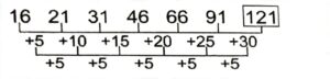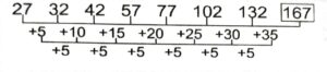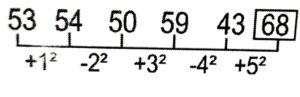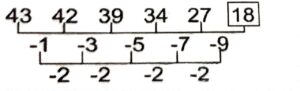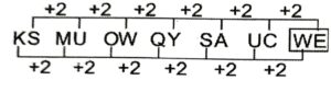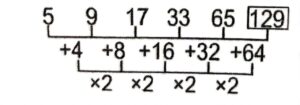 Series (SSC MTS 2022 Tier – 1)Total Questions: 5031. KS, MU, OW, QY, SA, UC, ? [S.S.C MTS 12/05/2023 (Evening)](a) WD(b) EW(c) WE(d) WSCorrect Answer: (c) WESolution:The pattern followed here is :Hence, "WE" is the correct answer.32. 53, 54, 50, 59, 43, ? [S.S.C MTS 15/05/2023 (Morning)](a) 68(b) 61(c) 18(d) 58Correct Answer: (a) 68Solution:The pattern followed here is :Hence, "68" is the correct answer.33. 27, 32, 42, 57, 77, 102, 132, ? [S.S.C MTS 15/05/2023 (Afternoon)](a) 172(b) 167(c) 149(d) 158Correct Answer: (b) 167Solution:The pattern followed here is :Hence, "167" is the correct answer.34. 16, 21, 31, 46, 66, 91, ? [S.S.C MTS 16/05/2023 (Morning)](a) 243(b) 121(c) 211(d) 112Correct Answer: (b) 121Solution:The pattern followed here is :Hence, "121" is the correct answer.35. 3, 9, 54, 648, 15552, ? [S.S.C MTS 16/05/2023 (Morning)](a) 746496(b) 124583(c) 746946(d) 78342Correct Answer: (a) 746496Solution:The pattern followed here is :Hence, "746496" is the correct answer.36. 43, 42, 39, 34, 27, ? [S.S.C MTS 17/05/2023 (Evening)](a) 18(b) 21(c) 16(d) 20Correct Answer: (a) 18Solution:The pattern followed here is :Hence, "18" is the correct answer.37. ND, KA, HX, EU, ? [S.S.C MTS 18/05/2023 (Morning)](a) AR(b) BS(c) BT(d) BRCorrect Answer: (d) BRSolution:The pattern followed here is :Hence, "BR" is the correct answer.38. RAQ, TCS, VEU, ?, ZIY [S.S.C MTS 19/05/2023 (Morning)](a) XHW(b) XHX(c) XGW(d) XGXCorrect Answer: (c) XGWSolution:The pattern followed here is :Hence, "XGW" is the correct answer.39. PAKC, NDIF, LGGI, JJEL, ? [S.S.C MTS 19/05/2023 (Afternoon)](a) HMCO(b) HMCP(c) HNCO(d) IMLOCorrect Answer: (a) HMCOSolution:The pattern followed here is :Hence, "HMCO" is the correct answer.40. 5, 9, 17, 33, 65, ? [S.S.C MTS 19/05/2023 (Afternoon)](a) 140(b) 130(c) 129(d) 128Correct Answer: (c) 129Solution:The pattern followed here is :Hence, "129" is the correct answer.Submit Quiz« Previous12345Next »