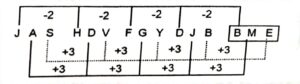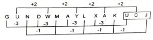 First letter decreases by 1, the second letter increases by 2, the third letter and fourth letter remain the same.