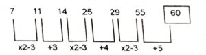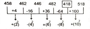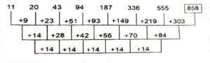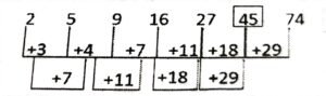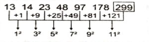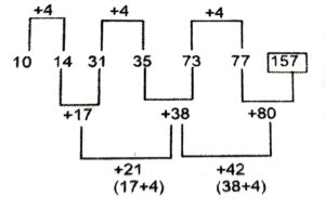 Series (Varieties Questions)Total Questions: 4721. 10, 20, 23, ?, 97, 582 [S.S.C CHSL 25/05/2022 (Morning)](a) 78(b) 78(c) 82(d) 92Correct Answer: (d) 92Solution:The pattern followed here is :Hence, "92" is the correct answer.22. 13, 14, 23, 48, 97, 178, ? [S.S.C CHSL 24/05/2022 (Evening)](a) 259(b) 279(c) 269(d) 299Correct Answer: (d) 299Solution:The pattern followed here is :Hence, "299" is the correct answer.23. 11, 20, 43, 94, 187, 336, 555, ? [S.S.C CHSL 24/05/2022 (Morning)](a) 777(b) 888(c) 858(d) 688Correct Answer: (c) 858Solution:The pattern followed here is :Hence, "858" is the correct answer.24. 458, 462, 446, 482, ?, 518 [S.S.C CHSL 24/05/2022 (Morning)](a) 428(b) 496(c) 546(d) 418Correct Answer: (d) 418Solution:The pattern followed here is :Hence, "418" is the correct answer.25. 7, 11, 14, 25, 29, 55, ? [S.S.C CGL 13/04/2022 (Evening)](a) 59(b) 60(c) 68(d) 63Correct Answer: (b) 60Solution:The pattern followed here is :Hence, "60" is the correct answer.26. LGG, PJL, KMO, OPT, LSG, ? [S.S.C CGL 12/04/2022 (Evening)](a) PVL(b) OVK(c) NUL(d) PUKCorrect Answer: (a) PVLSolution:The pattern followed here is :Hence, "PVL" is the correct answer.27. 45, 68, 99, ?, 187, 246, 313 [S.S.C CGL 11/04/2022 (Evening)](a) 140(b) 177(c) 166(d) 105Correct Answer: (a) 140Solution:The pattern followed here is :The difference between given numbers are alternate consecutive prime numbers.Hence, "140" is the correct answer.28. KMTC, EVOM, OQXG, IZSQ, ? [S.S.C CGL 11/04/2022 (Evening)](a) SUCL(b) SVCK(c) TVBK(d) SUBKCorrect Answer: (d) SUBKSolution:The pattern followed here is :Hence, "SUBK" is the correct answer.29. 10, 14, 31, 35, 73, 77, ? [S.S.C CGL 11/04/2022 (Evening)](a) 154(b) 90(c) 157(d) 81Correct Answer: (c) 157Solution:The pattern followed here is :Hence, "157" is the correct answer.30. 2, 5, 9, 16, 27, ?, 74 [S.S.C MTS 25/10/2021 (Afternoon)](a) 43(b) 45(c) 48(d) 39Correct Answer: (b) 45Solution:The pattern followed here is :In the second line, we see the pattern that the next number is the sum of the previous two numbers:Hence, "45" is the correct answer.Submit Quiz« Previous12345Next »