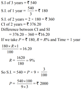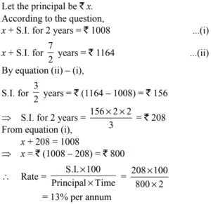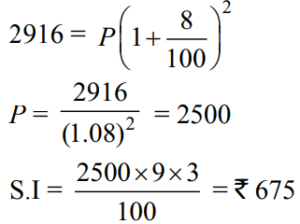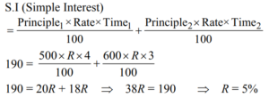 SIMPLE AND COMPOUND INTEREST (QUANTITATIVE APTITUDE) EPFO UPSCTotal Questions: 3021. The difference between the compound interest and simple interest for the amount ₹ 5,000 in 2 years is ₹ 32. The rate of interest is(a) 5% (b) 8%(c) 10% (d) 12%Correct Answer: (b) 8%Solution:22. A sum becomes ₹ 2,916 in 2 years at 8% per annum compound interest. The simple interest at 9% per annum for 3 years on the same amount will be(a) ₹ 625 (b) ₹ 600 (c) ₹ 675(d) ₹ 650Correct Answer: (c) ₹ 675Solution:23. A person deposited ₹ 500 for 4 years and ₹ 600 for 3 years at the same rate of simple interest in a bank. Altogether he received ₹ 190 as interest. The rate of simple interest per annum was(a) 3% (b) 4% (c) 5%(d) 2%Correct Answer: (c) 5%Solution:24. A sum of money placed at compound interest doubles itself in 5 years. It will amount to eight times of itself in :(a) 15 years (b) 12 years (c) 10 years (d) 20 yearsCorrect Answer: (a) 15 years Solution:25. The simple interest an ₹ 4,000 in 3 years at the rate of x% per annum equals the simple interest on ₹ 5,000 at the rate of 12% per annum in 2 years. The value of x is(a) 8% (b) 9% (c) 10%(d) 6%Correct Answer: (c) 10%Solution:26. If the compound interest on a certain sum for two years at 12% per annum is ₹ 2,544, the simple interest on it at the same rate for 2 years will be(a) ₹ 2,400 (b) ₹ 2,500 (c) ₹ 2,480 (d) ₹ 2,440Correct Answer: (a) ₹ 2,400 Solution:27. A certain amount of money earns ₹ 540 as Simple Interest in 3 years. If it earns a Compound Interest of ₹ 376.20 at the same rate of interest in 2 years, find the amount. (in rupees)(a) 2100 (b) 1600 (c) 1800 (d) 2000Correct Answer: (d) 2000Solution:28. The simple interest accrued on an amount of ₹ 2,500 at the end of six years is ₹ 1,875. What would be the simple interest accrued on an amount of ₹ 6,875 at the same rate and same period?(a) ₹ 4,556.5 (b) ₹ 5,025.25 (c) ₹ 4,895.25 (d) None of theseCorrect Answer: (d) None of theseSolution:29. What amount a man would have received on a principal of ₹ 4,000 after two years at simple interest at the rate of 5 per cent per annum?(a) ₹ 4,161 (b) ₹ 5,200 (c) ₹ 4,400(d) ₹ 4,100Correct Answer: (c) ₹ 4,400Solution:30. A certain sum of money amounts to ₹ 1008 in 2 years and the same sum of money amounts to ₹ 1164 in 3 years and 6 months at simple interest. Find the sum and the rate of interest.(a) ₹ 900, 14% p.a. (b) ₹ 800, 13% p.a.(c) ₹ 700, 12% p.a. (d) ₹ 800, 19% p.a.Correct Answer: (b) ₹ 800, 13% p.a.Solution:Submit Quiz« Previous123