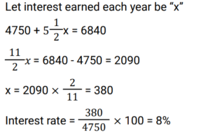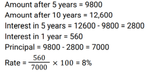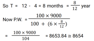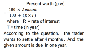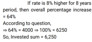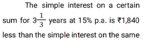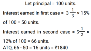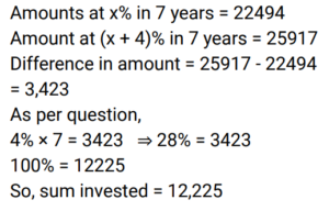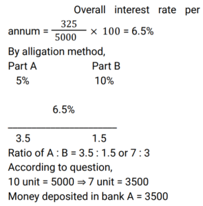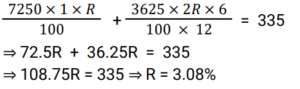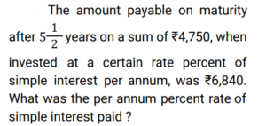 Simple Interest (Railway Maths) (Part – II)Total Questions: 501. A sum of ₹7,250 is lent under simple interest at the beginning of a year at a certain rate of interest per annum. After 6 months, a sum of ₹3,625 more is lent under simple interest but at a rate that is twice the former. At the end of the year, ₹335 is earned as interest from both the loans taken together. What was the rate of interest per annum at which the initial ₹7,250 was lent? [Give your answer correct to 2 decimal places.] [Group D 11/10/2022 (Morning) ](a) 3.08%(b) 3.00%(c) 3.10%(d) 3.12%Correct Answer: (a) 3.08%Solution:2. A trader owes a merchant ₹9,000 due in one year. However, the trader wants to settle the amount after 4 months. If the rate of interest is 6% per annum, then how much money should he pay? (Give your answer correct to the nearest whole number value.) [Group D 11/10/2022 (Afternoon)](a) ₹8,686(b) ₹8,654(c) ₹8,645(d) ₹8,688Correct Answer: (b) ₹8,654Solution:3. A sum of ₹5,000 is divided into two parts. One part is deposited in bank A at simple interest at 5% per annum, and the other part is deposited in bank B at simple interest at 10% per annum. If the total annual interest received is ₹325, then the money deposited in bank A was: [Group D 11/10/2022 (Afternoon)](a) ₹5,000(b) ₹3,500(c) ₹4,000(d) ₹1,500Correct Answer: (b) ₹3,500Solution:4. A sum was invested at a certain rate of simple interest per annum for 8 years. Had it been invested at a rate of simple interest per annum that is 8% higher than the rate at which the sum had been actually invested, it would have fetched ₹4,000 more as interest at the end of the 8-year period. What was the sum invested? [Group D 11/10/2022 (Evening) ](a) ₹6,250(b) ₹6,750(c) ₹6,925(d) ₹6,500Correct Answer: (a) ₹6,250Solution:5. Out of a total sum of ₹5,000, Danish invested one part at 12% simple interest per annum and the remaining part at 10% simple interest per annum. If the total interest that accrued to Danish in two years equals ₹1072, what was the sum Danish invested at 12 % simple interest per annum ? [Level 6 (09/05/2022) Shift 1 ](a) ₹2,150(b) ₹1,750(c) ₹1,800(d) ₹2,000Correct Answer: (c) ₹1,800Solution:6. Find the answer of given question? [Level 6 (09/05/2022) Shift 2 ](a) 9%(b) 8.5%(c) 8%(d) 7.5%Correct Answer: (c) 8%Solution:7. Find the answer of given question? [Level 6 (09/05/2022) Shift 2 ](a) 12,500(b) 11,500(c) 13,500(d) 10,105Correct Answer: (b) 11,500Solution:8. A certain sum amounts to Rs 22,494 in 7 years at x% per annum on simple interest. If the rate of simple interest per annum had been (x + 4)%, the amount payable after 7 years would have been Rs 25,917. Find the sum invested. [Level 5 (12/06/2022) Shift 1](a) 11,975(b) 12,275(c) 12,175(d) 12,225Correct Answer: (d) 12,225Solution:9. The amount payable on maturity of a certain sum which is invested for 5 years at a certain rate per annum is Rs 9,800 and the amount payable on the same sum invested for 10 years at the same rate is Rs 12,600. If simple interest is offered in both cases, the rate of interest per annum is: [Level 5 (12/06/2022) Shift 1](a) 10%(b) 7.8%(c) 8.5%(d) 8%Correct Answer: (d) 8%Solution:10. The amount payable on maturity of a certain sum invested at a certain rate of interest per annum for one year was ₹1,484. If the rate of interest had been 2% higher, the amount would have been ₹26.50 more. What was the interest that was paid on the sum invested at the original rate? [Level 5 (12/06/2022) Shift 2](a) ₹152.50(b) ₹161(c) ₹157(d) ₹159Correct Answer: (d) ₹159Solution:Submit Quiz12345Next »