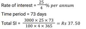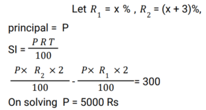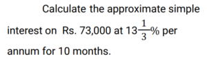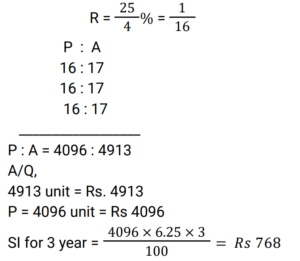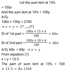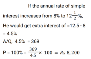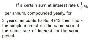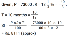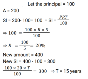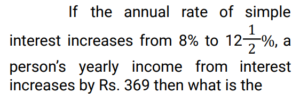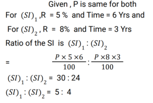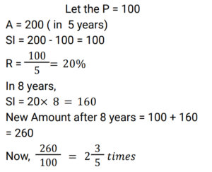 Simple Interest (Railway Maths) (Part – III)Total Questions: 5021. Find the answer of given question? [RRB NTPC 12/03/2021 (Morning) ](a) Rs. 764(b) Rs. 756(c) Rs. 768(d) Rs. 766Correct Answer: (c) Rs. 768Solution:22. Find the answer of given question? [RRB NTPC 12/03/2021 (Evening) ](a) Rs. 7,500(b) Rs. 8,111(c) Rs. 6,112(d) Rs. 9,000Correct Answer: (b) Rs. 8,111Solution:23. The ratio of simple interest earned by a certain amount at the rate of 5% for 6 years and 8% for 3 years is: [RRB NTPC 13/03/2021 (Evening) ](a) 5 : 4(b) 3 : 2(c) 2 : 3(d) 4 : 5Correct Answer: (a) 5 : 4Solution:24. The simple interest on Rs. 10,000 for 6 months at the rate of 5 paise per rupee per month is: [RRB NTPC 13/03/2021 (Evening) ](a) Rs. 3,000(b) Rs. 1,000(c) Rs. 2,000(d) Rs. 1,500Correct Answer: (a) Rs. 3,000Solution:25. Find the answer of given question? [RRB NTPC 14/03/2021 (Morning) ](a) Rs. 8,100(b) Rs. 8,500(c) Rs. 8,200(d) Rs. 8,150Correct Answer: (c) Rs. 8,200Solution:26. If at simple interest, an amount doubles in 5 years, how many times of the original amount, will it be after 8 years at the same rate of simple interest? [RRB NTPC 14/03/2021 (Morning) ](a)(b)(c)(d)Correct Answer: (d)Solution:27. A sum of Rs. 2700 is lent out in two parts in such a way that, the simple interest on one part at 15% for 4 years is equal to the simple interest on the second part at 10% for 6 years. The part of the sum lent out at 15% is.. [RRB NTPC 14/03/2021 (Evening) ](a) Rs. 1150(b) Rs. 1250(c) Rs. 1350(d) Rs. 1450Correct Answer: (c) Rs. 1350Solution:28. Find the answer of given question? [RRB NTPC 14/03/2021 (Evening) ](a) Rs. 40(b) Rs. 37.50(c) Rs. 35.50(d) Rs. 42.80Correct Answer: (b) Rs. 37.50Solution:29. A sum of money doubles at simple interest in 5 years. In how many years will it become four times itself? [RRB NTPC 19/03/2021 (Evening)](a) 11(b) 12(c) 15(d) 14Correct Answer: (c) 15Solution:30. A sum was invested at a simple interest at a certain rate for 2 years. Had it been invested at a 3% higher rate, it would have fetched Rs. 300 more. Find the sum invested. [RRB NTPC 21/03/2021 (Morning)](a) Rs. 4,500(b) Rs. 5,200(c) Rs. 6,000(d) Rs. 5,000Correct Answer: (d) Rs. 5,000Solution:Submit Quiz« Previous12345Next »