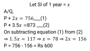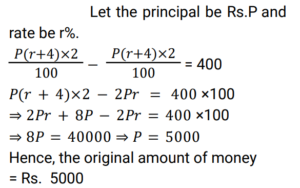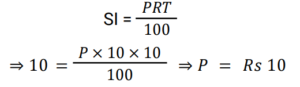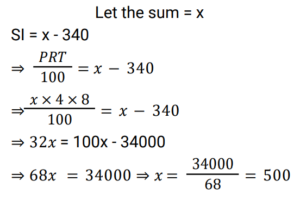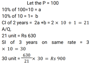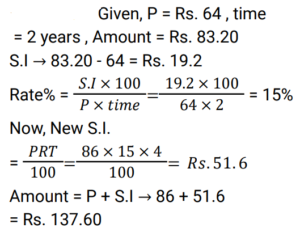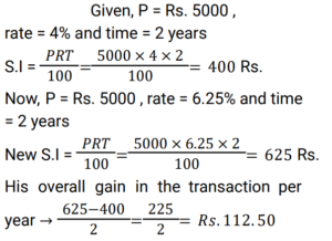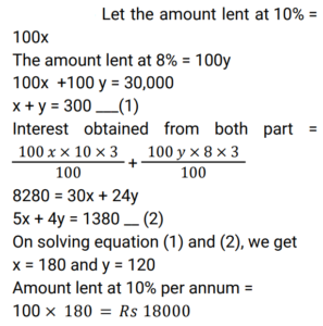 Simple Interest (Railway Maths) (Part – III)Total Questions: 5031. A certain sum of money, invested on simple interest, amounts to Rs. 756 in 2 years and to Rs. 873 in 3.5 years. Find the sum (in Rs.). [RRB NTPC 21/03/2021 (Evening)](a) 500(b) 700(c) 600(d) 400Correct Answer: (c) 600Solution:32. A person lent a certain sum of money at the rate of 4% simple interest per annum. In 8 years, the interest amounted to Rs. 340 less than the sum lent. Find the sum lent. [RRB NTPC 27/03/2021 (Morning)](a) Rs. 600(b) Rs. 800(c) Rs. 500(d) Rs. 400Correct Answer: (c) Rs. 500Solution:33. A man lent a part of Rs. 30,000 at the rate of 10% per annum and the remaining at the rate of 8% per annum simple interest. The total interest he received after 3 years is Rs. 8,280. Find the amount he lent at 10% per annum. [RRB NTPC 27/03/2021 (Morning)](a) Rs. 16,000(b) Rs. 20,000(c) Rs. 19,000(d) Rs. 18,000Correct Answer: (d) Rs. 18,000Solution:34. The interest on a sum of money at 10% p.a. for 2 years with interest being compounded annually is Rs. 630. Find the simple interest (in Rs.) on the sum at the same rate of interest for 3 years. [RRB NTPC 03/04/2021 (Morning)](a) 850(b) 900(c) 650(d) 950Correct Answer: (b) 900Solution:35. A sum of money amounts to Rs. 850 in 3 years and Rs. 925 in 4 years on simple interest. What is the sum? [RRB NTPC 03/04/2021 (Evening)](a) Rs. 625(b) Rs. 700(c) Rs. 850(d) Rs. 925Correct Answer: (a) Rs. 625Solution:36. The simple interest on a sum of money borrowed is Rs. 10 at the rate of 10% p.a. for 10 years. How much is the sum of money borrowed? [RRB NTPC 05/04/2021 (Morning)](a) Rs. 100(b) Rs. 10(c) Rs. 10,000(d) Rs. 1,000Correct Answer: (b) Rs. 10Solution:37. Kumar lent an amount to Arif at a simple interest rate of 10% p.a. for 3 years, and Arif lent this amount to Naresh at a simple interest rate of 20% p.a. for 3 years. If Arif gained Rs. 1,560 in this process, then what was the amount that Kumar had lent to Arif? [RRB NTPC 07/04/2021 (Evening)](a) Rs. 6,200(b) Rs. 5,600(c) Rs. 5,400(d) Rs. 5,200Correct Answer: (d) Rs. 5,200Solution:38. The Simple Interest on some amount of money for 2 years is Rs. 400. If the rate of interest is 4% more, then the Simple Interest will be Rs. 400 more. What is the original amount of money? [RRB JE 22/05/2019 (Afternoon)](a) Rs. 5,000(b) Rs. 4,000(c) Rs. 10,000(d) Rs. 12,000Correct Answer: (a) Rs. 5,000Solution:39. If Rs. 64 amounts to Rs. 83.20 in 2 years, what will Rs. 86 amount to in 4 years at the same rate of Simple Interest? [RRB JE 22/05/2019 (Evening)](a) Rs. 124.70(b) Rs. 137.60(c) Rs. 114.8(d) Rs. 127.40Correct Answer: (b) Rs. 137.60Solution:40. A person borrows Rs.5000 for 2 years at 4% per annum Simple Interest. He immediately lends it to another person at 6.25% per annum for 2 years. Find his annual gain in the transaction ? [RRB JE 22/05/2019 (Evening) ](a) Rs.167.50(b) Rs.112.50(c) Rs.125(d) Rs.150Correct Answer: (b) Rs.112.50Solution:Submit Quiz« Previous12345Next »