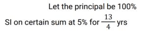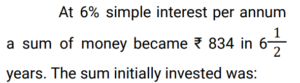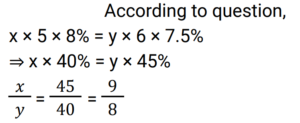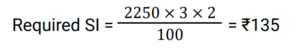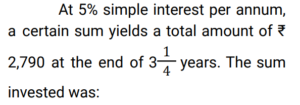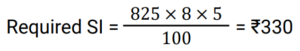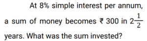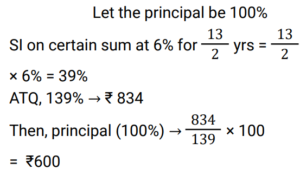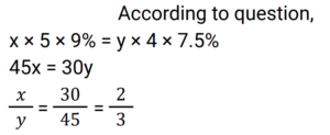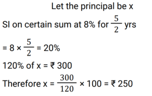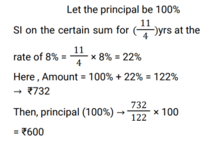 Simple Interest (Railway Maths) (Part – IV)Total Questions: 3621. A sum of money invested for 2 years and 9 months at the rate of 8% simple interest per annum became ₹732 at the end of the period. What was the sum that was initially invested? [RRB ALP 10/08/2018 (Evening) ](a) ₹ 600(b) ₹ 575(c) ₹ 550(d) ₹ 585Correct Answer: (a) ₹ 600Solution:22. Find the answer of given question? [RRB ALP 13/08/2018 (Morning) ](a) ₹ 650(b) ₹ 600(c) ₹ 675(d) ₹ 626Correct Answer: (b) ₹ 600Solution:23. The interest earned on ₹ 2250 at the rate of 3% simple interest per annum for 2 years will be: [RRB ALP 13/08/2018 (Afternoon) ](a) ₹225(b) ₹135(c) ₹202.50(d) ₹67.50Correct Answer: (b) ₹135Solution:24. Find the answer of given question? [RRB ALP 14/08/2018 (Afternoon) ](a) ₹275(b) ₹240(c) ₹250(d) ₹260Correct Answer: (c) ₹250Solution:25. Rahi deposited ₹600 in a bank that promised 8% simple interest per annum. If Rahi kept the money with the bank for 5 years, she will earn an interest of: [RRB ALP 14/08/2018 (Afternoon) ](a) ₹480(b) ₹240(c) ₹280(d) ₹200Correct Answer: (b) ₹240Solution:26. Find the answer of given question? [RRB ALP 17/08/2018 (Afternoon) ](a) ₹2,400(b) ₹2,350(c) ₹2,600(d) ₹2,550Correct Answer: (a) ₹2,400Solution:27. The interest on ₹1250 for 6 years at the rate of 4% simple interest per annum will be: [RRB ALP 17/08/2018 (Afternoon)](a) ₹350(b) ₹300(c) ₹360(d) ₹375Correct Answer: (b) ₹300Solution:28. Saathi deposited ₹825 in a bank that promised 8% simple interest per annum. If Saathi kept the money with the bank for 5 years, she will earn an interest of: [RRB ALP 20/08/2018 (Morning)](a) ₹330(b) ₹290(c) ₹480(d) ₹280Correct Answer: (a) ₹330Solution:29. ₹x invested at 8% simple interest per annum for 5 years yields the same interest as that of ₹y invested at 7.5% simple interest per annum for 6 years. Find x : y. [RRB ALP 21/08/2018 (Morning)](a) 16 : 15(b) 40 : 45(c) 9 : 8(d) 5 : 6Correct Answer: (c) 9 : 8Solution:30. ₹x invested at 9% simple interest per annum for 5 years yields the same interest as that of ₹y invested at 7.5% simple interest per annum for 4 years. Find x : y. [RRB ALP 29/08/2018 (Afternoon) ](a) 45 : 30(b) 8 : 9(c) 16 : 15(d) 2 : 3Correct Answer: (d) 2 : 3Solution:Submit Quiz« Previous1234Next »