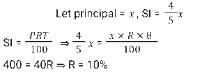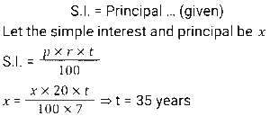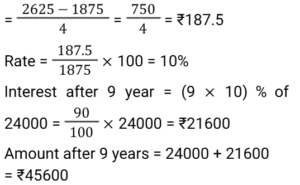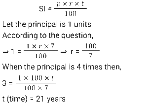 Simple Interest (SSC) (Part-2)Total Questions: 5021. If ₹1,875 becomes ₹2,625 in 4 years, what will ₹24,000 become at the end of 9 years at the same rate of interest, under simple interest? [SSC CGL 26/09/2024 (1st Shift)](a) ₹45,600(b) ₹21,600(c) ₹34,800(d) ₹43,200Correct Answer: (a) ₹45,600Solution:Interest for one year22. In how many years will the simple interest on a sum of money be equal to 6 the principal at the rate of 2 ⁶⁄₇ % per annum? [SSC CHSL 01/07/2024 (1st Shift)](a) 34 years(b) 37 years(c) 35 years(d) 33 yearsCorrect Answer: (c) 35 yearsSolution:23. Reshma took a loan of ₹12,00,000 with simple interest for as many years as the rate of interest. If she paid ₹9,72,000 as interest at the end of the loan period, what was the rate of interest per annum. [SSC CHSL 01/07/2024 (2nd Shift)](a) 9%(b) 8.7%(c) 8%(d) 7.5%Correct Answer: (a) 9%Solution:24. An amount becomes double in 7 years on simple interest. The amount would be four times in _______ years on the same rate of simple interest. [SSC CHSL 01/07/2024 (3rd Shift)](a) 14(b) 18(c) 21(d) 28Correct Answer: (c) 21Solution:25. The simple interest on a sum of money for 1½ years at 10% per annum is ₹30 more than the simple interest on the same sum for 1 year at 12% per annum. Find the sum. [SSC CHSL 02/07/2024 (2nd Shift)](a) ₹1,050(b) ₹1,250(c) ₹1,000(d) ₹1,20Correct Answer: (c) ₹1,000Solution:26. A man invested a sum of ₹5,000 on simple interest for 5 years such that the rate of interest for the first 2 years is 10% per annum, for the next 3 years it is 12% per annum How much interest (in ₹), will he earn at the end of 5 years? [SSC CHSL 03/07/2024 (2nd Shift)](a) 3180(b) 3000(c) 2450(d) 2800Correct Answer: (d) 2800Solution:27. The simple interest on a sum for 8 years is 4/5 of the sum. The rate of interest per annum is: [SSC CHSL 03/07/2024 (4th Shift)](a) 15%(b) 5%(c) 20%(d) 10%Correct Answer: (d) 10%Solution:28. How much time (in years) will it take for an amount of ₹4,50,000 to yield 45,000 as simple interest at a 5% per annum rate of interest? [SSC CHSL 04/07/2024 (2nd Shift)](a) 4(b) 2(c) 5(d) 3Correct Answer: (b) 2Solution:29. An amount of ₹8,000 was invested for 2 years, partly in scheme 1 at the rate of 5% simple interest per annum and the rest in scheme 2 at the rate of 4% simple Interest per annum. The total interest received at the end was ₹720. The amount of money invested in scheme 1 is: [SSC CHSL 04/07/2024 (4th Shift)](a) ₹7,200(b) ₹4,400(c) ₹3,640(d) ₹4,000Correct Answer: (d) ₹4,000Solution:30. An equal sum of money was lent to P and Q at 8.6% per annum for a period of 7 years and 8 years, respectively. If the difference in interest paid by them was ₹172, then the sum lent to each was: [SSC CHSL 05/07/2024 (2nd Shift)](a) ₹2,000(b) ₹3,000(c) ₹2,150(d) ₹185Correct Answer: (a) ₹2,000Solution:Submit Quiz« Previous12345Next »