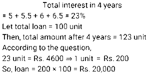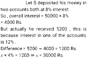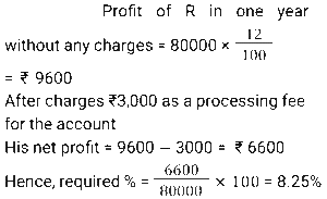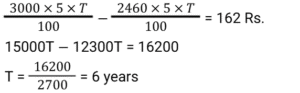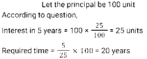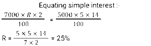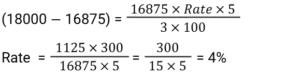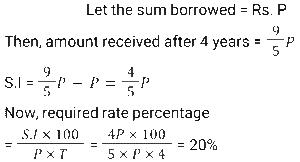 Simple Interest (SSC) (Part-3)Total Questions: 5041. A sum of money invested at a certain rate of simple interest per annum amounts to ₹14,522 in seven years and to ₹18,906 in eleven years. Find the sum invested (in ₹). [SSC CGL 17/07/2023 (2nd shift)](a) 6850(b) 6900(c) 6800(d) 6750Correct Answer: (a) 6850Solution:42. A person took a loan at 5% per annum simple interest during the first year and with an increase of 0.5% simple interest every year from the second year onwards. After 4 years, he paid ₹4,600 as a total interest to settle the loan completely. How much was the loan? [SSC CGL 17/07/2023 (3rd shift)](a) ₹ 20,000(b) ₹ 19,000(c) ₹ 18,000(d) ₹21,000Correct Answer: (a) ₹ 20,000Solution:43. If the simple interest for 5 years is equal to 25% of the principal, then the interest will be equal to the principal after________years. [SSC CGL 18/07/2023 (1st shift)](a) 20(b) 30(c) 25(d) 22Correct Answer: (a) 20Solution:44. A man took a loan of ₹32,400 at a certain rate of simple interest per annum. The rate of interest is one-fourth of the number of years for which the loan is taken. If he paid ₹11,664 as interest at the end of the loan period, the rate of interest was: [SSC CGL 19/07/2023 (2nd shift)](a) 3%(b) 8%(c) 5%(d) 12%Correct Answer: (a) 3%Solution:45. A person borrowed some money on simple interest. After 4 years, he returned 9/5 of the money to the lender. What was the rate of interest? [SSC CGL 21/07/2023 (2nd shift)](a) 25% р.а.(b) 10% p.a.(c) 15% р.а.(d) 20% p.a.Correct Answer: (d) 20% p.a.Solution:46. R wants to deposit ₹80,000 in the bank for a year. In his account, the bank gives 12% simple annual interest but charges ₹3,000 as a processing fee for the account. What would be his percentage earnings in the account? [SSC CGL 21/07/2023 (4th shift)](a) 8.75%(b) 9%(c) 8.5%(d) 8.25%Correct Answer: (d) 8.25%Solution:47. S deposits a total of ₹50,000 in two accounts which give 8% and 12% simple interest annually, respectively. After one year, he gets a total ₹5,200. How much money does he deposit in the account with a 12% interest rate? [SSC CGL 25/07/2023 (4th shift)](a) ₹30,000(b) ₹32,000(c) ₹20,000(d) ₹25,000Correct Answer: (a) ₹30,000Solution:48. A sum of ₹16,875 was lent out at simple interest, and at the end of 1 year 8 months, the total amount was 18,000. Find the rate of interest per annum. [Graduate Level 27/06/2023 (Shift-4)](a) 3.7%(b) 4%(c) 5%(d) 6.66%Correct Answer: (b) 4%Solution:49. The simple interest on ₹2,460 will be 162 less than the simple interest on ₹3,000 at the rate of 5% per annum simple interest. Find the time taken in years. [Graduate Level 28/06/2023 (Shift-3)](a) 4(b) 6(c) 5(d) 3Correct Answer: (b) 6Solution:50. The simple interest earned on ₹7,000 in 2 years at the rate of R% per annum equals the simple interest earned on ₹5,000 at the rate of 5% per annum in 14 years. The value of R (in percentage) is: [Matriculation Level 27/06/2023 (Shift-1)](a) 28%(b) 15%(c) 25%(d) 20%Correct Answer: (c) 25%Solution:Submit Quiz« Previous12345
