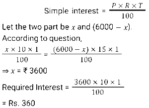 10. A sum of Rs.6000 is divided into two parts. The annual simple interest on the first part at the annual rate of 10 percent is equal to the annual simple interest on the second part at the annual rate of 15 percent. How much is the interest on each part for one year? [SSC MTS 14/06/2023 (Morning)]