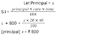 2. A person lent a certain sum of money at the annual rate of 20 percent on simple interest. In 10 years, the interest amounted to Rs. 800 more than the sum lent. What is the sum lent? [SSC MTS 09/05/2023 (Afternoon)]