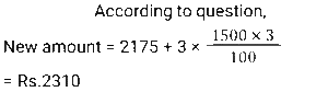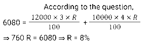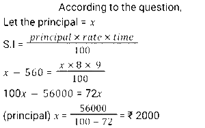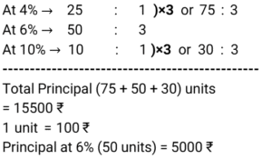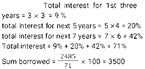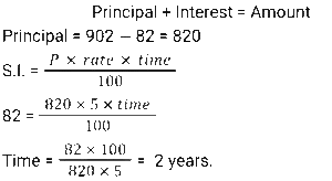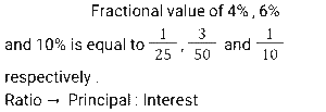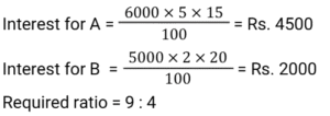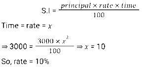 Simple Interest (SSC) (Part-4)Total Questions: 4011. A sum of Rs.1500 amounts to Rs.2175 in 3 years at simple interest. If rate of interest is increased by 3 percent, then what will be the new amount? [SSC MTS 15/06/2023 (Morning)](a) Rs.2310(b) Rs.2050(c) Rs.2460(d) Rs.2250Correct Answer: (a) Rs.2310Solution:12. A = Rs 6000 is invested at simple interest for 5 years and annual rate of interest is 15 percent. B = Rs. 5000 is invested at simple interest for 2 years and annual rate of interest is 20 percent. What is the ratio of interests earned in A and B respectively? [SSC MTS 19/06/2023 (Morning)](a) 19 : 12(b) 9 : 4(c) 16 : 5(d) 18 : 11Correct Answer: (b) 9 : 4Solution:13. A person lent certain sum of money at the annual rate of 8 percent on simple interest and the interest received in 9 years is Rs. 560 less than the sum lent. What is the sum lent? [SSC MTS 20/06/2023 (Morning)](a) Rs.560(b) Rs.1000(c) Rs.2000(d) Rs.1120Correct Answer: (c) Rs.2000Solution:14. Rohan borrows a certain sum at simple interest Rate of interest is 3 percent per annum for first 3 years. 4 percent per annum for next 5 years and 6 percent per annum for next 7 years. If he paid Rs. 2485 as interest, then what is the sum borrowed? [SSC MTS 20/06/2023 (Evening)](a) Rs. 2500(b) Rs. 3500(c) Rs. 4000(d) Rs. 3600Correct Answer: (b) Rs. 3500Solution:15. A person lent Rs. 12,000 to B for 3 years and Rs. 10,000 to C for 4 years on simple interest at the same rate of interest and received Rs.6,080 in all from both of them as interest. What is the annual rate of interest? [SSC CHSL 14/03/2023 (1st Shift)](a) 15%(b) 8%(c) 11%(d) 5%Correct Answer: (b) 8%Solution:16. A person invested a total sum of Rs. 15,500 in three different schemes of simple interest at the annual rate of 4 percent, 6 percent and 10 percent. At the end of one year he got same interest in all three schemes. What is the sum invested at the rate of 6 percent? [SSC CHSL 14/03/2023 (4th Shift)](a) Rs.5400(b) Rs.5000(c) Rs.5500(d) Rs.6500Correct Answer: (b) Rs.5000Solution:17. Rs.P are invested at 5% per annum of simple interest. After T years an interest of Rs.82 is earned and the amount becomes Rs.902. What is the value of T? [SSC CHSL 15/03/2023 (3rd Shift)](a) 4 years(b) 1 year(c) 3 years(d) 2 yearsCorrect Answer: (d) 2 yearsSolution:18. A sum of Rs. 3000 becomes Rs. 6000 when invested in a scheme of simple interest. If the annual rate of interest and the number of years for which the sum was invested are same, then what is the annual rate of interest? [SSC CHSL 17/03/2023 (1st Shift)](a) 5%(b) 20%(c) 10%(d) 15%Correct Answer: (c) 10%Solution:19. In how much time will a sum of Rs.12500 amounts to Rs. 20000 at the rate of 8 percent per annum at simple interest? [SSC CGL Tier II 21/03/2023 (2nd Shift)](a) 10 years(b) 7.5 years(c) 8 years(d) 12.5 yearsCorrect Answer: (b) 7.5 yearsSolution:20. The difference of simple interest from two banks on ₹8,000 in 3 years is ₹800. If the rate of interest per annum in two banks are R1 and R2, then what is the value of R1 - R2? (Where R1 > R2) [SSC CGL Tier II (02/03/2023)](a) 5 ⅓%(b) 3 ⅓%(c) 1 ⅓%(d) 2 ⅓%Correct Answer: (b) 3 ⅓%Solution:Submit Quiz« Previous1234Next »