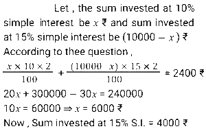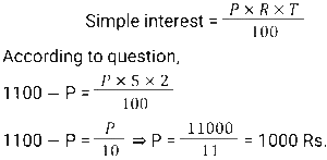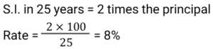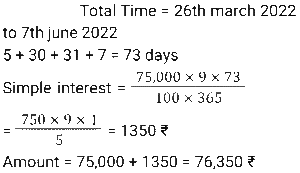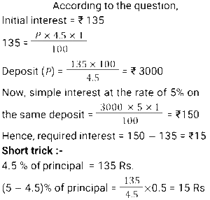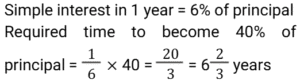 Simple Interest (SSC)Total Questions: 5011. A financial institution claims that it returns three times the principal in 25 years on a certain rate of simple interest per annum. What is the rate of simple interest? [SSC CHSL 03/08/2023 (4th Shift)](a) 8%(b) 6%(c) 4%(d) 5%Correct Answer: (a) 8%Solution:12. The simple interest on a certain sum for 3 years at 8% per annum is ₹9120 less than the simple interest on the same sum for 7 years at 8% per annum. Find the sum. [SSC CHSL 03/08/2023 (1st Shift)](a) ₹28500(b) ₹28250(c) ₹28750(d) ₹28000Correct Answer: (a) ₹28500Solution:13. Ashima borrowed ₹75,000 from a nationalized bank on 26th March 2022 at the rate of 9% per annum simple interest. If she cleared the account on 7th June of the same year, then what amount did she pay? [SSC CHSL 02/08/2023 (3rd Shift)](a) ₹75,000(b) ₹76,350(c) ₹1,350(d) ₹75,350Correct Answer: (b) ₹76,350Solution:14. How long (in years) will a sum of money invested at 6% per annum simple interest to increase its value by 40% ? [SSC CHSL 02/08/2023 (1st Shift)](a) 6 ⅔(b) 5 ⅔(c) 6 ⅓(d) 4 ⅓Correct Answer: (a) 6 ⅔Solution:15. What is the present worth of ₹1,100 due in 2 years at 5% simple interest per annum ? [SSC CGL 26/07/2023 (3rd shift)](b) ₹2,000(c) ₹3,000(a) ₹1,000(d) ₹1,500Correct Answer: (a) ₹1,000Solution:16. The interest on a certain deposit at 4.5% p.a. is ₹135 in one year. How much will the additional interest in one year be on the same deposit at 5% p.a.? [SSC CGL 24/07/2023 (3rd shift)](a) ₹16(b) ₹15(c) ₹14(d) ₹18Correct Answer: (a) ₹16Solution:17. A certain amount is lent at x% p.a. simple interest for 3 years. Instead, if the amount was lent at 3x% p.a. simple interest for 'y' more years, then the simple interest would have been seven times the earlier interest. What is the value of y ? [SSC CGL 21/07/2023 (3rd shift)](a) 3(b) 4(c) 5(d) 6Correct Answer: (b) 4Solution:18. Archana took a loan of ₹78,000 from a bank on 24ᵗʰ January 2012 at 8 (¾) % per annum simple interest and paid it back on 18ᵗʰ June 2012. Find the total amount paid by Archana. (Approximated to nearest integer) [SSC CGL 19/07/2023 (3rd shift)](a) ₹80,723(b) 90,730(c) 85,733(d) ₹88,730Correct Answer: (b) 90,730Solution:19. A man invests a total sum of ₹10,000 in a company. A part of the sum was invested at 10% simple interest per annum and the remaining part at 15% simple interest per annum. If the total interest accrued to him in two years equals ₹2,400, the sum invested at 15% simple interest per annum is: [SSC CGL 14/07/2023 (3rd shift)](a) ₹8,000(b) ₹4,000(c) ₹6,000(d) ₹5,000Correct Answer: (a) ₹8,000Solution:20. A money lender finds that due to the fall in the annual rate of interest from 18% to 15%, his yearly income diminishes by Rs.750. His capital is: [Graduate Level 30/06/2023 (Shift-1)](a) Rs.25,500(b) Rs.25,000(c) Rs.5,000(d) Rs.2,500Correct Answer: (b) Rs.25,000Solution:Submit Quiz« Previous12345Next »