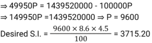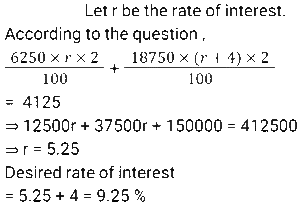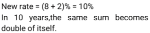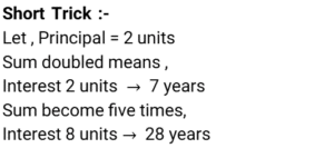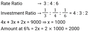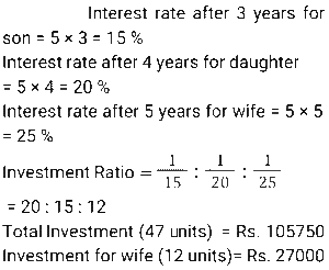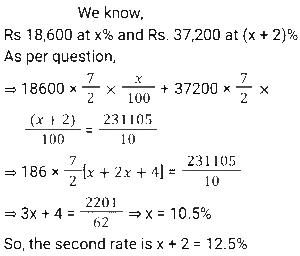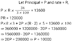 Simple Interest (SSC)Total Questions: 5031. A certain sum amounts to Rs 81840 in 3 years and to Rs 92,400 in 5 years at x% p.a. Under simple interest. If the rate of interest becomes (x + 2)%, then in how many years will the same sum double itself? [SSC CGL 20/08/2021 (Morning)](a) 12.5(b) 8(c) 10(d) 20Correct Answer: (c) 10Solution:32. A man invested an amount of Rs 105750 at simple interest in the name of his son, daughter and his wife in such a way that they get the same interest after 3, 4 and 5 years respectively. If the rate of interest is 5% per annum, then the amount invested for the wife is: [SSC CHSL 12/08/2021 (Evening)](a) 27000(b) 28000(c) 25000(d) 30000Correct Answer: (a) 27000Solution:33. A person invested a total of ₹9,000 in three parts at 3%, 4% and 6% per annum on simple interest. At the end of a year, he received equal interest in all three cases. The amount invested at 6% is: [SSC CHSL 12/08/2021 (Evening)](a) ₹2000(b) ₹3000(c) ₹4000(d) ₹5000Correct Answer: (a) ₹2000Solution:34. A man takes a loan of some amount at some rate of simple interest. After three years, the loan amount is doubled and the rate of interest is decreased by 2%. After 5 years, if the total interest paid on the whole is Rs 13,600, which is equal to the same when the first amount was taken for 11 ⅓ years, then the loan taken initially is: [SSC CHSL 14/10/2020 (Afternoon)](a) Rs 13,600(b) Rs 12,500(c) Rs 10,000(d) Rs 12,000Correct Answer: (c) Rs 10,000Solution:35. A sum of Rs. 12,000 was borrowed at a rate of simple interest. After four months, Rs. 6000 more was borrowed and rate of interest on the total principal was doubled than that of the previous rate. At the end of the year, 2800 was paid as the interest. Find the rate that was applicable in the initial. [SSC CHSL 13/10/2020 (Morning)](a) 14%(b) 16%(c) 12%(d) 10%Correct Answer: (d) 10%Solution:36. A person invested a sum of Rs. 18,600 at x % p.a. and another sum that is twice the former at (x + 2) % p.a., both at a simple interest. If the total interest earned on both investments 3 ½ years is Rs 23,110.50, then the rate of interset p.a. on the second investments is. [SSC CPO 11/12/2019 (Morning)](a) 11%(b) 10.5%(c) 13%(d) 12.5%Correct Answer: (d) 12.5%Solution:37. A person invested one-fourth of the sum of Rs 25000 at a certain rate of simple interest and the rest at 4% p.a. higher rate. If the total interest received for 2 years is Rs 4,125. What is the rate at which the second sum was invested? [SSC CGLTier II (13/09/2019)](a) 9.5%(b) 9.25%(c) 5.255%(d) 7.5%Correct Answer: (b) 9.25%Solution:38. A sum amounts to Rs 14,395.20 at 9.25% p.a. simple interest in 5.4 years. What will be the simple interest on the same sum at 8.6% p.a. in 4.5 years? [SSC CGL Tier II (12/09/2019)](a) Rs 3715.20(b) Rs 3627(c) Rs 3797.76(d) Rs 3672Correct Answer: (a) Rs 3715.20Solution:39. The simple interest on Rs x for m years at a rate of r % is equal to the same on Rs y for n years at the rate of s %, then x/y is equal to: [SSC MTS 16/08/2019 (Morning)](a) nr/ms(b) ns/mr(c) ms/nr(d) mr/nsCorrect Answer: (b) ns/mrSolution:40. A sum doubles in seven years at simple interest. In how many years will the sum become five times the original sum? [SSC MTS 09/08/2019 (Afternoon)](a) 35(b) 21(c) 28(d) 30Correct Answer: (c) 28Solution:Submit Quiz« Previous12345Next »