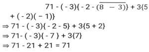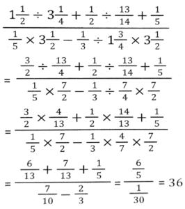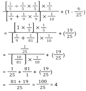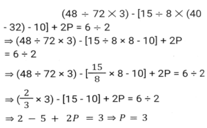 Simplification (Part-3)Total Questions: 5021. If (48 ÷ 72 × 3) - [15 ÷ 8 × (40 - 32) - 10] + 2P = 6 ÷ 2, then find the value of P [SSC CPO 03/10/2023 (3rd Shift)](a) 2(b) 4(c) 1(d) 3Correct Answer: (d) 3Solution:22. The value of.... [SSC CPO 05/10/2023 (1st Shift)](a) 38(b) 33(c) 36(d) 40Correct Answer: (c) 36Solution:23. Simplify the given expression. [SSC CPO 05/10/2023 (3rd Shift)]b + 2a - [(3b + a) - (2a + b) + 2a] - a(a) -a(b) -b(c) a(d) bCorrect Answer: (b) -bSolution:24. Simplify the given expression. [SSC MTS 04/09/2023 (3rd Shift)](a) 30(b) 119(c) 50(d) 71Correct Answer: (d) 71Solution:25. Simplify [SSC MTS 11/09/2023 (1st Shift)](a)(b)(c)(d)Correct Answer: (c)Solution:26. What is the value of.... [SSC MTS 12/09/2023 2023 (2nd Shift)](a) 2(b) 1(c) 3(d) 4Correct Answer: (d) 4Solution:27. If the mathematical symbols in the expression given below are changed from '+' to '÷' '-' to' ×',÷' to '-'and '×' to '+'. then what will be the value of the expression? [SSC CHSL 07/08/2023 (3rd Shift)]87 × 256 + 16 - 77 ÷ 1359(a) 20(b) -40(c) 40(d) -20Correct Answer: (b) -40Solution:28. Simplify [SSC CHSL 08/08/2023 (2nd Shift)](a) 1/6(b) 6(c) 1/9(d) 9Correct Answer: (d) 9Solution:29. Simplify the given expression. [SSC CHSL 08/08/2023 (2nd Shift)](a) 0.6755(b) 0.9025(c) 0.8125(d) 0.7835Correct Answer: (c) 0.8125Solution:30. Simplify [SSC CHSL 08/08/2023 (4th Shift)](a) 7.7(b) 9.9(c) 8.8(d) 6.6Correct Answer: (b) 9.9Solution:Submit Quiz« Previous12345Next »