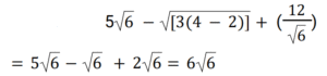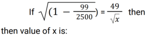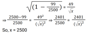 Simplification (Railway Maths) (151 to 200)Total Questions: 5011. The value of 5√6 − √[3(4 − 2)] + (12/√6) is: [Group D 08/09/2022 (Evening)](a) 8√6(b) 7√6(c) 5√6(d) 6√6Correct Answer: (d) 6√6Solution:12. The value of √625 + √0.25 − √0.000025 is: [Group D 08/09/2022 (Evening)](a) 25.405(b) 25.5(c) 25.395(d) 25.495Correct Answer: (d) 25.495Solution:13. The value of 39 ÷ {6 × (6/7 of 7/8)} is: [Group D 09/09/2022 (Morning)](a) 25/3(b) 28/3(c) 26/3(d) 23/3Correct Answer: (c) 26/3Solution:14. The value of (0.1 × 0.001 × 0.0001 × 10⁶) is: [Group D 09/09/2022 (Morning)](a) 1(b) 1/10(c) 100(d) 1/100Correct Answer: (d) 1/100Solution:15. If 9x = 55² - 35², then the value of x is: [Group D 09/09/2022 (Morning) ](a) 400(b) 200(c) 300(d) 500Correct Answer: (b) 200Solution:9x = 55² - 35² ⇒ 9𝑥 = 3025 − 1225 ⇒ 9𝑥 = 1800 ⇒ 𝑥 = 20016. Find the answer of given question? [Group D 09/09/2022 (Afternoon) ](a) 456/991(b) 425/990(c) 431/990(d) 430/991Correct Answer: (c) 431/990Solution:17. The value of (279 ÷ 31) + (363 ÷ 33) - (512 ÷ 16) is: [Group D 09/09/2022 (Afternoon) ](a) 1.9(b) -11(c) 10(d) -12Correct Answer: (d) -12Solution:(279 ÷ 31) + (363 ÷ 33) - (512 ÷ 16) ⇒ 9 + 11 - 32 = -1218. Find the answer of given question? [Group D 09/09/2022 (Afternoon) ](a) 49(b) 2500(c) 2401(d) 50Correct Answer: (b) 2500Solution:19. Find the answer of given question? [Group D 09/09/2022 (Evening) ](a) 7/45(b) 6/49(c) 8/45(d) 5/49Correct Answer: (c) 8/45Solution:20. The value of (2²⁵ ÷ 2¹⁵) × 2⁴ is: [Group D 12/09/2022 (Morning)](a) 2¹⁴(b) 2¹⁰(c) 2¹¹(d) 2¹³Correct Answer: (a) 2¹⁴Solution:Submit Quiz« Previous12345Next »