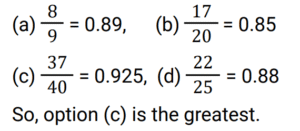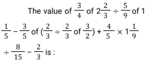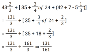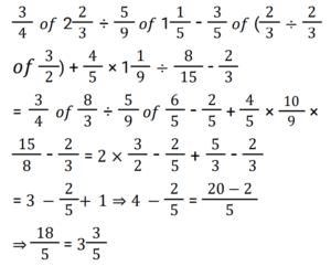 Simplification (Railway Maths) (301 to 350)Total Questions: 5021. Which of the following fractions is the greatest? [Level 5 (15/06/2022) Shift 1 ](a) 8/9(b) 17/20(c) 37/40(d) 22/25Correct Answer: (c) 37/40Solution:22. Evaluate: 2.91² - 1.09² / 1.82: [Level 5 (15/06/2022) Shift 1 ](a) 3(b) 2(c) 5(d) 4Correct Answer: (d) 4Solution:23. Simplify : [Level 5 (15/06/2022) Shift 1 ]65 – [40 – (60 ÷ 5 – (18 – 24 ÷ 4) ÷ 6)](a) 30(b) 40(c) 37(d) 35Correct Answer: (d) 35Solution:24. Find the answer of given question? [Level 5 (15/06/2022) Shift 2 ](a) 9/100(b) 37/33(c) -5/11(d) -7/33Correct Answer: (d) -7/33Solution:25. Simplify the expression: [Level 5 (15/06/2022) Shift 2 ](a) 25/4(b) 15/4(c) 30(d) 15Correct Answer: (d) 15Solution:26. Evaluate: [Level 5 (15/06/2022) Shift 2 ](a) 1/7(b) 1/4(c) 1/8(d) 1/10Correct Answer: (c) 1/8Solution:27. Evaluate: ³√16384 ÷ ³√256 [Level 5 (15/06/2022) Shift 3 ](a) 6(b) 4(c) 2(d) 3Correct Answer: (b) 4Solution:28. Simplify the following expression, 0.002 + 5.025 – 35.08 – 5.058 [Level 5 (15/06/2022) Shift 3 ](a) – 45.165(b) – 35.111(c) 35.111(d) 45.165Correct Answer: (b) – 35.111Solution:0.002 + 5.025 - 35.08 - 5.058 = 5.027 - 40.138 = - 35.11129. Simplify the equation? [Level 2 (16/06/2022) Shift 1 ](a)(b)(c)(d)Correct Answer: (b)Solution:30. Simplify the equation? [Level 2 (16/06/2022) Shift 1 ](a) 91/161(b) 131/161(c) 121/161(d) 109/161Correct Answer: (b) 131/161Solution:Submit Quiz« Previous12345Next »