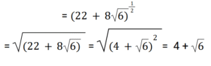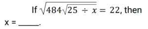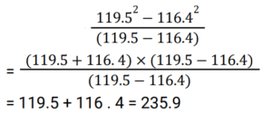 Simplification (Railway Maths) (501 to 550)Total Questions: 5041. The square root of 182.25 is: [RRB NTPC 04/03/2021 (Morning)](a) 13.5(b) 12.5(c) 11.25(d) 9.25Correct Answer: (a) 13.5Solution:√182 . 25 = 13.542. The value of [(56 + 34)² − (56 − 34)²] / (4 × 56 × 34) is: [RRB NTPC 04/03/2021 (Morning)](a) 2(b) 1(c) 3(d) 0Correct Answer: (b) 1Solution:43. Find the value of (119.5²− 116.4²) / (119.5 − 116.4). [RRB NTPC 04/03/2021 (Evening)](a) 235.1(b) 217.9(c) 3.1(d) 235.9Correct Answer: (d) 235.9Solution:44. Find the value of (22 + 8√6)¹/². [RRB NTPC 04/03/2021 (Evening)](a) 4 − √6(b) 16 + 2√6(c) 8 + 2√6(d) 4 + √6Correct Answer: (d) 4 + √6Solution:45. By how much is 2/3 of 3000 more than 2/5 of 1500? [RRB NTPC 04/03/2021 (Evening)](a) 1500(b) 1400(c) 1000(d) 2000Correct Answer: (b) 1400Solution:Difference between (2/3 of 3000) and (2/5 of 1500) = 2000 - 600 = 140046. If √625 ÷ √x = 1/5, then x = ? [RRB NTPC 04/03/2021 (Evening)](a) 125(b) 15625(c) 3125(d) 1225Correct Answer: (b) 15625Solution:√625 ÷ √x = 1/5 25 ÷ √x = 1/5 =√x = 125 ⇒ x = 1562547. Find the answer of given question? [RRB NTPC 04/03/2021 (Evening)](a) 25(b) 100(c) 75(d) 50Correct Answer: (a) 25Solution:√(484√25 ÷ x) = 22 ⇒ 484√25 ÷ x = 484⇒ √25 ÷ x = 1⇒ 25 ÷ x = 1⇒ x = 2548. The value of √142884 is: [RRB NTPC 05/03/2021 (Morning)](a) 358(b) 378(c) 368(d) 388Correct Answer: (b) 378Solution:√142884 = √(35721 × 2 × 2)= √(378 × 378)= 37849. Solve the given equation. [RRB NTPC 05/03/2021 (Morning)]√((544)² − (256)²)(a) 144(b) 288(c) 480(d) 400Correct Answer: (c) 480Solution:50. Convert 8/9 into a decimal number. [RRB NTPC 05/03/2021 (Evening)](a) 0.85(b) 0.88(c) 0.77(d) 0.91Correct Answer: (b) 0.88Solution:8/9 = 0.88Submit Quiz« Previous12345