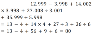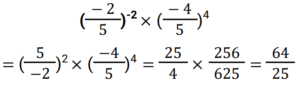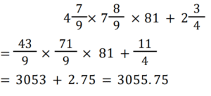 Simplification (Railway Maths) (51 to 100)Total Questions: 5041. The value of √(29 4/25) is: [Group D 23/08/2022 (Afternoon)](a) 5.4(b) 5.5(c) 5.6(d) 5.2Correct Answer: (a) 5.4Solution:42. The value of √729 + √1681 + √576 - √1849 is: [Group D 23/08/2022 (Afternoon) ](a) 55(b) 49(c) 64(d) 37Correct Answer: (b) 49Solution:√729 + √1681 + √576 − √1849 = 27 + 41 + 24 − 43 = 4943. Simplify the equation? [Group D 23/08/2022 (Evening) ](a) 3053.75(b) 3053.25(c) 3055.25(d) 3055.75Correct Answer: (d) 3055.75Solution:44. Find the value of the following: (-2/5)⁻² × (-4/5)⁴? [Group D 23/08/2022 ( Evening ) ](a) 26/25(b) 25/64(d) 25/26(c) 64/25Correct Answer: (c) 64/25Solution:45. Which of the following represents the closest approximate value that should come in place of the question mark (?) in the following equation? [Group D 23/08/2022 (Evening)]12.999 − 3.998 + 14.002 × 3.998 + 27.008 ÷ 3.001 + 35.999 ÷ 5.998 = ?(a) 68(b) 89(c) 72(d) 80Correct Answer: (d) 80Solution:46. Simplify x² + 5x − 12 − 3(x² − 2x + 9)? [Group D 23/08/2022 (Evening)](a) −2x² + 11x + 39(b) 2x² − 11x − 39(c) −2x² + 11x − 39(d) 2x² + 11x − 39Correct Answer: (c) −2x² + 11x − 39Solution:x² + 5x − 12 − 3(x² − 2x + 9) = x² + 5x − 12 − 3x² + 6x − 27 = −2x² + 11x − 3947. Simplify the equation? [Group D 24/08/2022 ( Morning ) ](a) 5/18(b) 18/7(c) 7/18(d) 18/5Correct Answer: (a) 5/18Solution:48. Simplify 423 × 423 − 325 × 325/ 423 - 325? [Group D 24/08/2022 (Morning) ](a) 748(b) 487(c) 478(d) 874Correct Answer: (a) 748Solution:49. Which of the following options is the closest approximate value which will come in place of question mark (?) in the following equation? [Group D 24/08/2022 (Morning) ]68.27 - 140.1 + 9.99 x 7.7 = ?(a) 8(b) 35(c) 16(d) 25Correct Answer: (a) 8Solution:68.27 − 140.1 + 9.99 × 7.7 = 68 − 140 + 10 × 8 = 68 − 140 + 80 = 850. The value of 12 + 12 x 12 - 12 ÷ 12 =? [Group D 24/08/2022 (Morning) ](a) 23(b) 140(c) 155(d) 0Correct Answer: (c) 155Solution:12 + 12 × 12 − 12 ÷ 12 = 12 + 144 − 1 = 155Submit Quiz« Previous12345