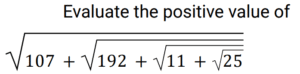 Simplification (Railway Maths) (551 to 600)Total Questions: 5011. Find the answer of given question? [RRB NTPC 07/03/2021 (Evening) ](a)(b)(c)(d)Correct Answer: (d)Solution:12. Find the answer of given question? [RRB NTPC 07/03/2021 (Evening) ](a) 5(b) 14(c) 11(d) 15Correct Answer: (c) 11Solution:13. Evaluate : (0.2)³ - (0.02)³? [RRB NTPC 07/03/2021 (Evening) ](a) 0.001002(b) 0.002992(c) 0.007992(d) 0.009992Correct Answer: (c) 0.007992Solution:(0.2)³ − (0.02)³= 0.008 − 0.000008= 0.00799214. Answer the following question? [RRB NTPC 07/03/2021 (Evening) ](a)12/7(b) 16/7(c) 15/7(d) 17/7Correct Answer: (d) 17/7Solution:15. Solve the following. [RRB NTPC 08/03/2021 (Morning) ](28.4)² - (24.4)² / (28.4 - 24.4) = ?(a) 52(b) 8(c) 52.8(d) 4Correct Answer: (c) 52.8Solution:(28.4)² - (24.4)² / (28.4 - 24.4) = 28.4 + 24.4 52.816. Find the positive value of [RRB NTPC 08/03/2021 (Morning) ](a) 12(b) 2(c) 3(d) 4Correct Answer: (d) 4Solution:Here we can write 12 into two consecutive factors 3, 4 ; i.e. 12 = 3 × 4 ; And as the sign is +ve, so we will take the larger factor = 4 ; So the value of 17. Solve the following. [RRB NTPC 08/03/2021 (Morning)](7 / 77) × 7777077 = ?(a) 7007007(b) 707007(c) 707077(d) 707070Correct Answer: (b) 707007Solution:7/77 × 7777077 = 101001 × 7 = 70700718. The product of 0.27 and 3.54 is less than 5.743 by how much? [RRB NTPC 08/03/2021 (Morning)](a) 0.7558(b) 3.89(c) 5.742(d) 4.7872Correct Answer: (d) 4.7872Solution:The product of 0.27 and 3.54 = 0.9558 ; Then the product of 0.27 and 3.54 is less than 5.743 by 4.7872.19. If √(5ⁿ) = 625, then the value of n is: [RRB NTPC 08/03/2021 (Evening)](a) 6(b) 7(c) 8(d) 9Correct Answer: (c) 8Solution:20. Answer the following question? [RRB NTPC 08/03/2021 (Evening)](a) 48(b) 23(c) 26(d) 75Correct Answer: (b) 23Solution:Submit Quiz« Previous12345Next »
